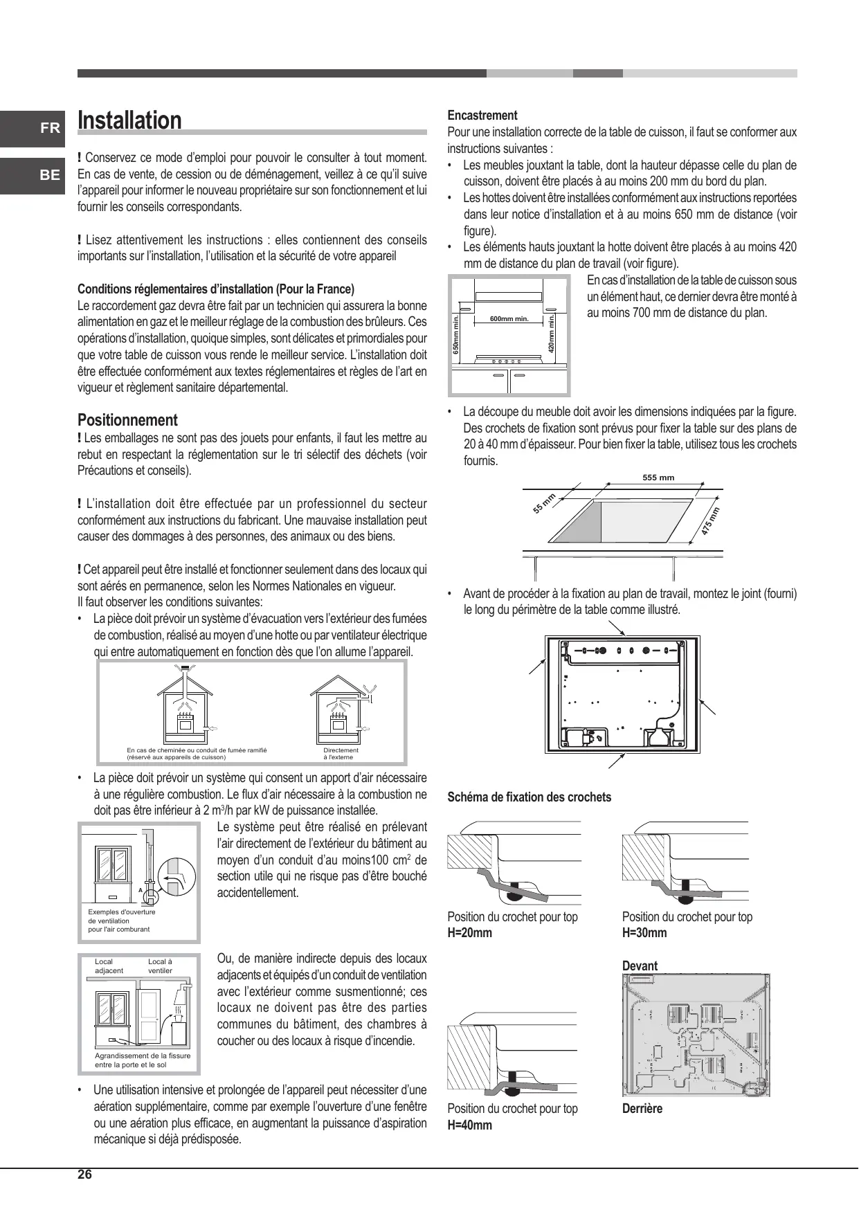- Avant de procéder à la fixation au plan de travail, montez le joint (fourni) le long du périmètre de la table comme illustré. Schéma de fixation des crochets Position du crochet pour top H=20mm Exemples d'ouverture de ventilation pour l'air comburant Local à ventiler 555 mm