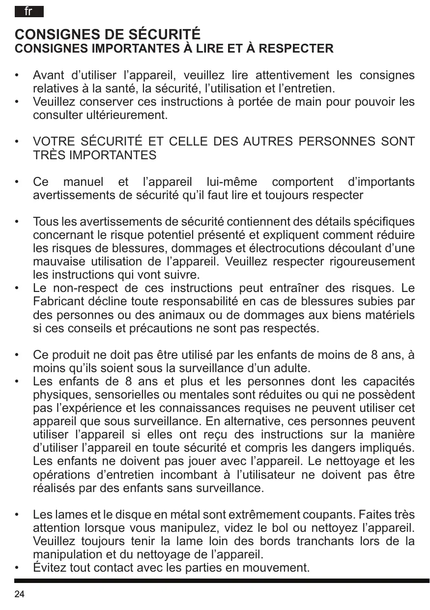 Ce produit ne doit pas être utilisé par les enfants de moins de 8 ans, à moins qu’ils soient sous la surveillance d’un adulte. Les enfants de 8 ans et plus et les personnes dont les capacités physiques, sensorielles ou mentales sont réduites ou qui ne possèdent pas l’expérience et les connaissances requises ne peuvent utiliser cet appareil que sous surveillance. En alternative, ces personnes peuvent utiliser l’appareil si elles ont reçu des instructions sur la manière d’utiliser l’appareil en toute sécurité et compris les dangers impliqués. Les enfants ne doivent pas jouer avec l’appareil. Le nettoyage et les opérations d’entretien incombant à l’utilisateur ne doivent pas être réalisés par des enfants sans surveillance. Les lames et le disque en métal sont extrêmement coupants. Faites très attention lorsque vous manipulez, videz le bol ou nettoyez l’appareil. Veuillez toujours tenir la lame loin des bords tranchants lors de la manipulation et du nettoyage de l’appareil. Évitez tout contact avec les parties en mouvement.