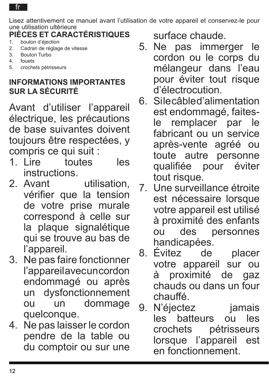 surface chaude. Ne pas immerger le cordon ou le corps du mélangeur dans l’eau pour éviter tout risque d’électrocution. Si le câble d’alimentation est endommagé, faitesle remplacer par le fabricant ou un service après-vente agréé ou toute autre personne qualifiée pour éviter tout risque. Une surveillance étroite est nécessaire lorsque votre appareil est utilisé à proximité des enfants ou des personnes handicapées. Évitez de placer votre appareil sur ou à proximité de gaz chauds ou dans un four chauffé. N’éjectez jamais les batteurs ou les crochets pétrisseurs lorsque l’appareil est en fonctionnement.