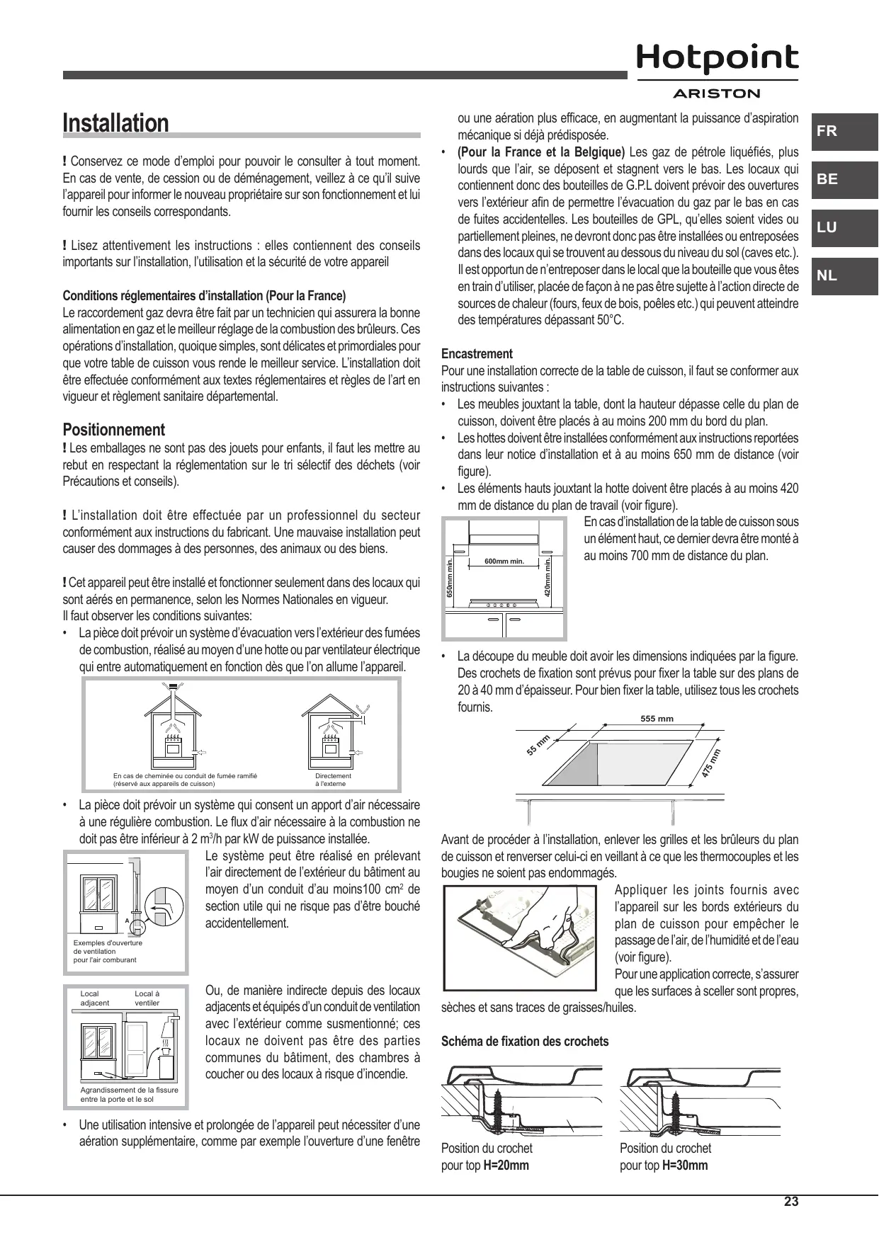 ! Utilisez tous les crochets compris dans le “sachet accessoires” • Si la table n’est pas installée au-dessus d’un four à encastrer, il faut monter un panneau d’isolation en bois. Il faut le monter à au moins 20 mm de distance du bord inférieur de la table. Aération Pour garantir une bonne aération, la cavité d’encastrement doit être dépourvue de paroi arrière. Il est conseillé d’installer le four de manière à ce qu’il repose sur deux cales en bois ou bien sur un plan d’appui continu qui ait une découpe d’au moins 45 x 560 mm (voir figures).