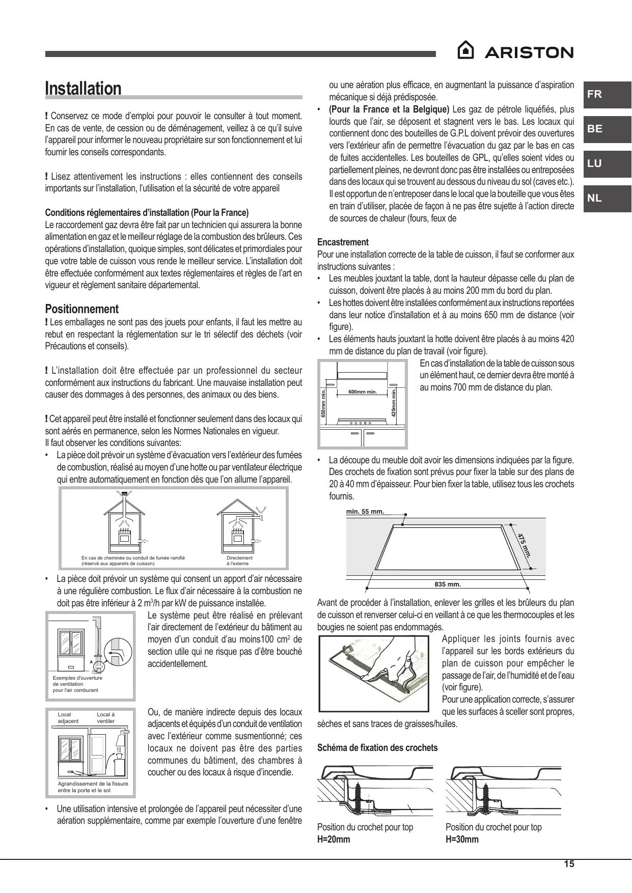 Conditions réglementaires d’installation (Pour la France) Le raccordement gaz devra être fait par un technicien qui assurera la bonne alimentation en gaz et le meilleur réglage de la combustion des brûleurs. Ces opérations d’installation, quoique simples, sont délicates et primordiales pour que votre table de cuisson vous rende le meilleur service. L’installation doit être effectuée conformément aux textes réglementaires et règles de l’art en vigueur et règlement sanitaire départemental.