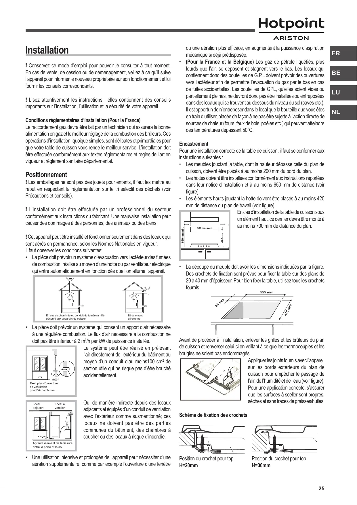 ! Lisez attentivement les instructions : elles contiennent des conseils importants sur l’installation, l’utilisation et la sécurité de votre appareil Conditions réglementaires d’installation (Pour la France) Le raccordement gaz devra être fait par un technicien qui assurera la bonne alimentation en gaz et le meilleur réglage de la combustion des brûleurs. Ces opérations d’installation, quoique simples, sont délicates et primordiales pour que votre table de cuisson vous rende le meilleur service. L’installation doit être effectuée conformément aux textes réglementaires et règles de l’art en vigueur et règlement sanitaire départemental. Positionnement ! Les emballages ne sont pas des jouets pour enfants, il faut les mettre au rebut en respectant la réglementation sur le tri sélectif des déchets (voir Précautions et conseils). ! L’installation doit être effectuée par un professionnel du secteur conformément aux instructions du fabricant. Une mauvaise installation peut causer des dommages à des personnes, des animaux ou des biens. ! Cet appareil peut être installé et fonctionner seulement dans des locaux qui sont aérés en permanence, selon les Normes Nationales en vigueur. Il faut observer les conditions suivantes: