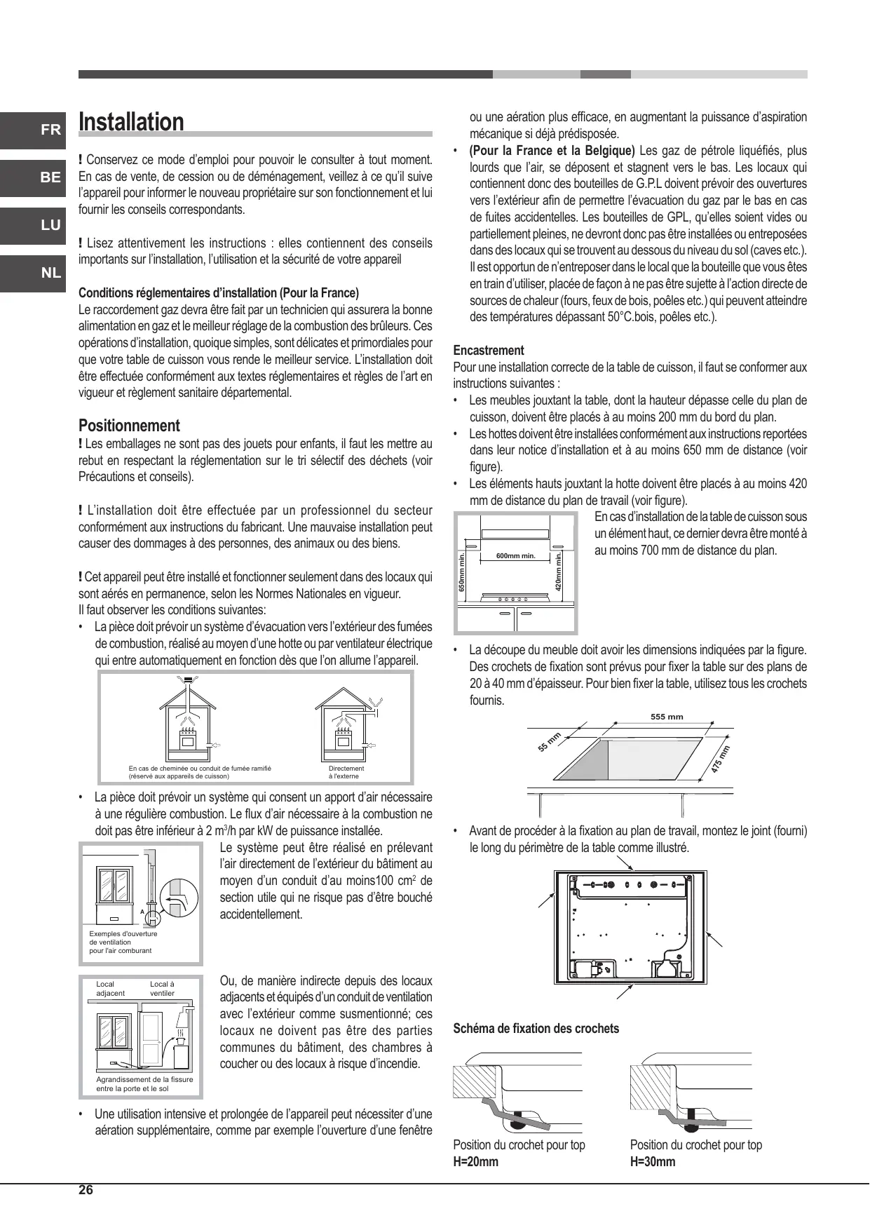 Conditions réglementaires d’installation (Pour la France) Le raccordement gaz devra être fait par un technicien qui assurera la bonne alimentation en gaz et le meilleur réglage de la combustion des brûleurs. Ces opérations d’installation, quoique simples, sont délicates et primordiales pour que votre table de cuisson vous rende le meilleur service. L’installation doit être effectuée conformément aux textes réglementaires et règles de l’art en vigueur et règlement sanitaire départemental.