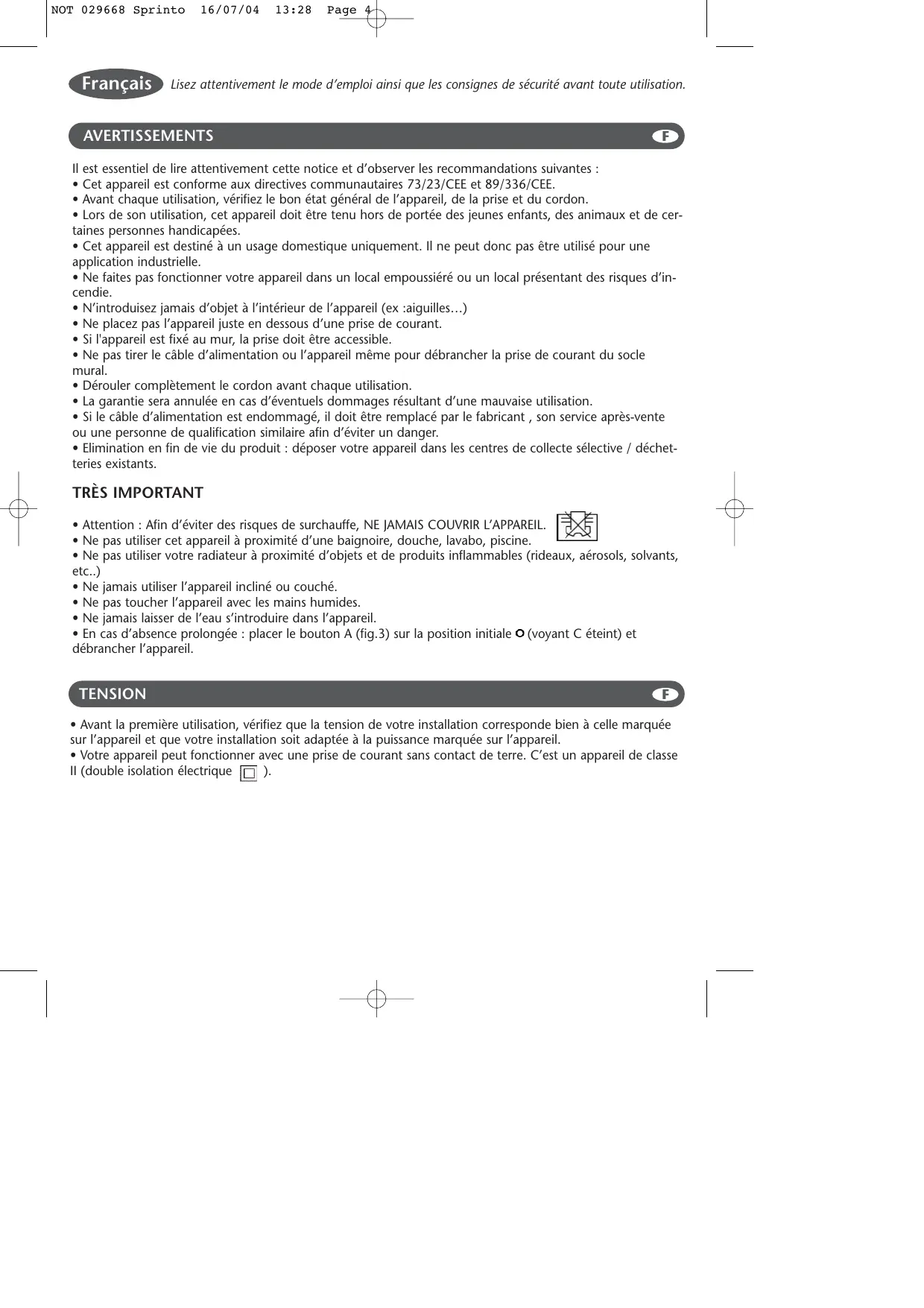 NOT 029668 Sprinto Français 16/07/04 13:28 Page 4 Lisez attentivement le mode d’emploi ainsi que les consignes de sécurité avant toute utilisation. AVERTISSEMENTS