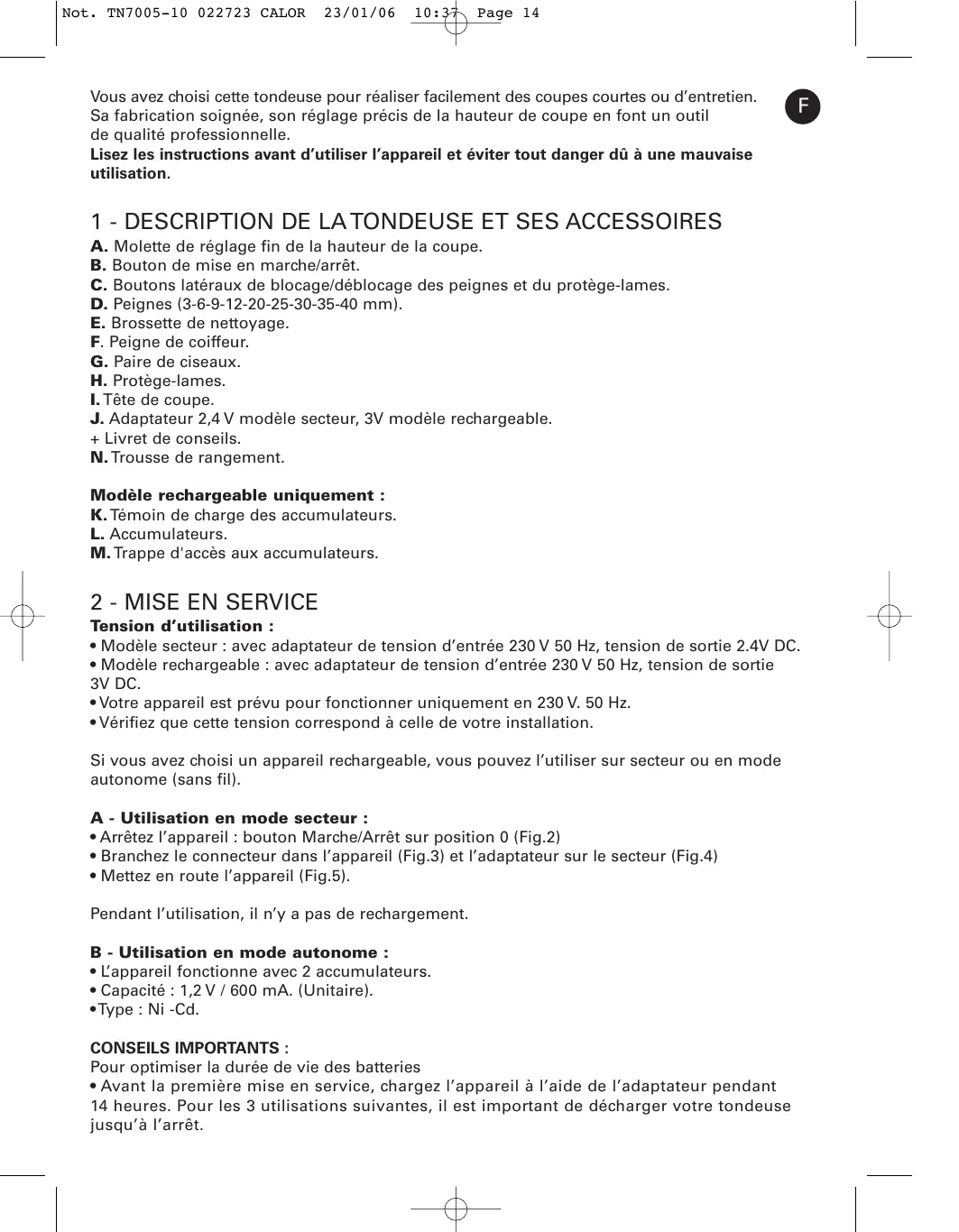 - Schneiden Sie die Haare am Rand des Barts, indem Sie den Haarschneider umdrehen und in senkrechter Haltung nach unten bewegen. In kleinen Stücken vorgehen. Not. TN7005-10 022723 CALOR 23/01/06 10:37 Page 14 Vous avez choisi cette tondeuse pour réaliser facilement des coupes courtes ou d’entretien. Sa fabrication soignée, son réglage précis de la hauteur de coupe en font un outil de qualité professionnelle. Lisez les instructions avant d’utiliser l’appareil et éviter tout danger dû à une mauvaise utilisation.
