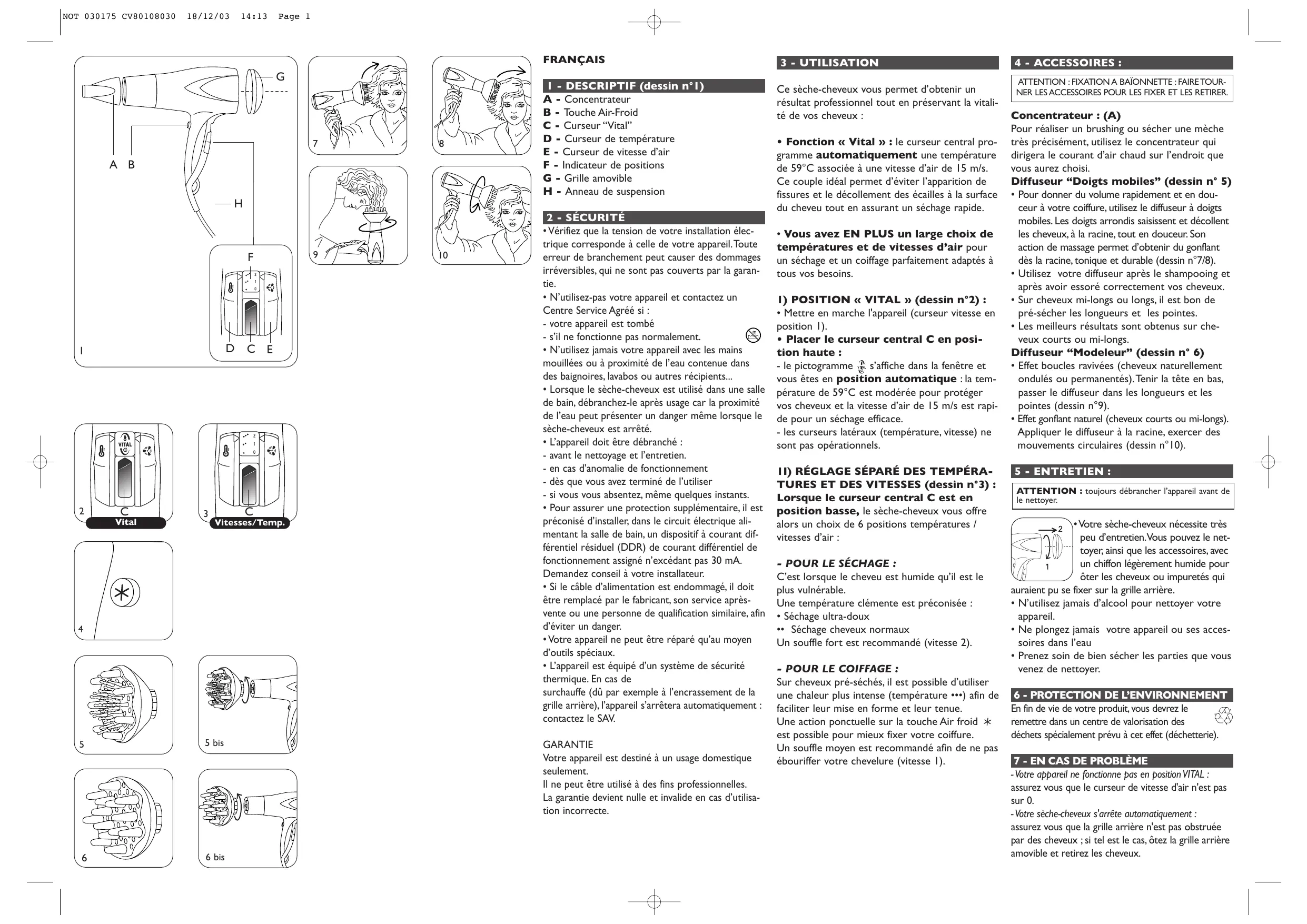 - Fonction « Vital »: le curseur central programme automatiquement une température de 59^ associée à une vitesse d'air de 15 m/s. Ce couple idéal permet d'éviter l' apparition de fissures et le décollement des écalles à la surface du cheveu tout en assurant un séchage rapide.