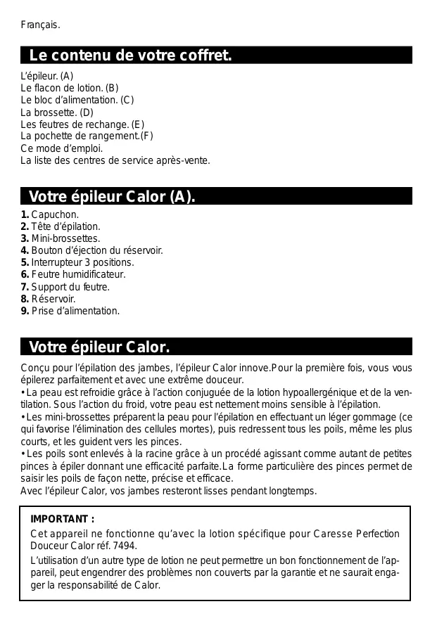 Cet appeareil ne fonctionne qu'avac la lotion spécifique pour Caresse Perfection Douceur Calor ref. 7494.