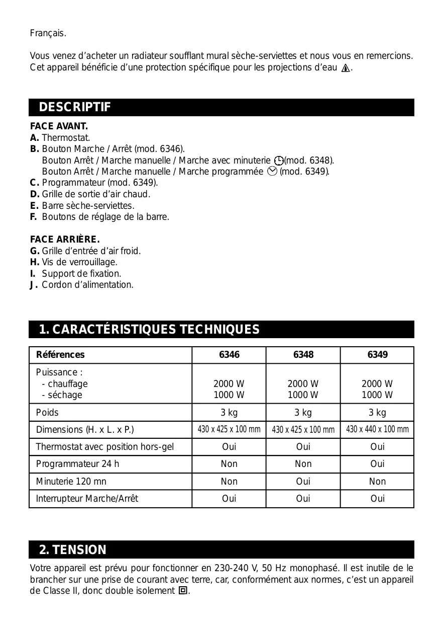 DESCRIPTIF FACE AVANT. A. Thermostat. B. Bouton Marche / Arrêt (mod. 6346). Bouton Arrêt / Marche manuelle / Marche avec minuterie (mod. 6348). Bouton Arrêt / Marche manuelle / Marche programmée (mod. 6349). C. Programmateur (mod. 6349). D. Grille de sortie d’air chaud. E. Barre sèche-serviettes. F. Boutons de réglage de la barre. FACE ARRIÈRE. G. Grille d’entrée d’air froid. H. Vis de verrouillage. I. Support de fixation. J. Cordon d’alimentation.