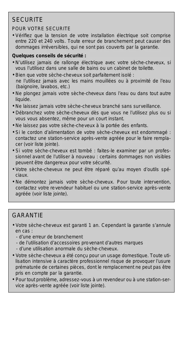 SECURITE POUR VOTRE SECURITE • Vérifiez que la tension de votre installation électrique soit comprise entre 220 et 240 volts. Toute erreur de branchement peut causer des dommages irréversibles, qui ne sont pas couverts par la garantie. Quelques conseils de sécurité : • N’utilisez jamais de rallonge électrique avec votre sèche-cheveux, si vous l’utilisez dans une salle de bains ou un cabinet de toilette. • Bien que votre sèche-cheveux soit parfaitement isolé : ne l’utilisez jamais avec les mains mouillées ou à proximité de l’eau (baignoire, lavabos, etc.) • Ne plongez jamais votre sèche-cheveux dans l’eau ou dans tout autre liquide. • Ne laissez jamais votre sèche-cheveux branché sans sur veillance. • Débranchez votre sèche-cheveux dès que vous ne l’utilisez plus ou si vous vous absentez, même pour un court instant. • Ne laissez pas votre sèche-cheveux à la portée des enfants. • Si le cordon d’alimentation de votre sèche-cheveux est endommagé : contactez une station-service après-vente agréée pour le faire remplacer (voir liste jointe). • Si votre sèche-cheveux est tombé : faites-le examiner par un professionnel avant de l’utiliser à nouveau : certains dommages non visibles peuvent être dangereux pour votre sécurité. • Votre sèche-cheveux ne peut être réparé qu’au moyen d’outils spéciaux. • Ne démontez jamais votre sèche-cheveux. Pour toute intervention, contactez votre re vendeur habituel ou une station-service après-vente agréée (voir liste jointe).