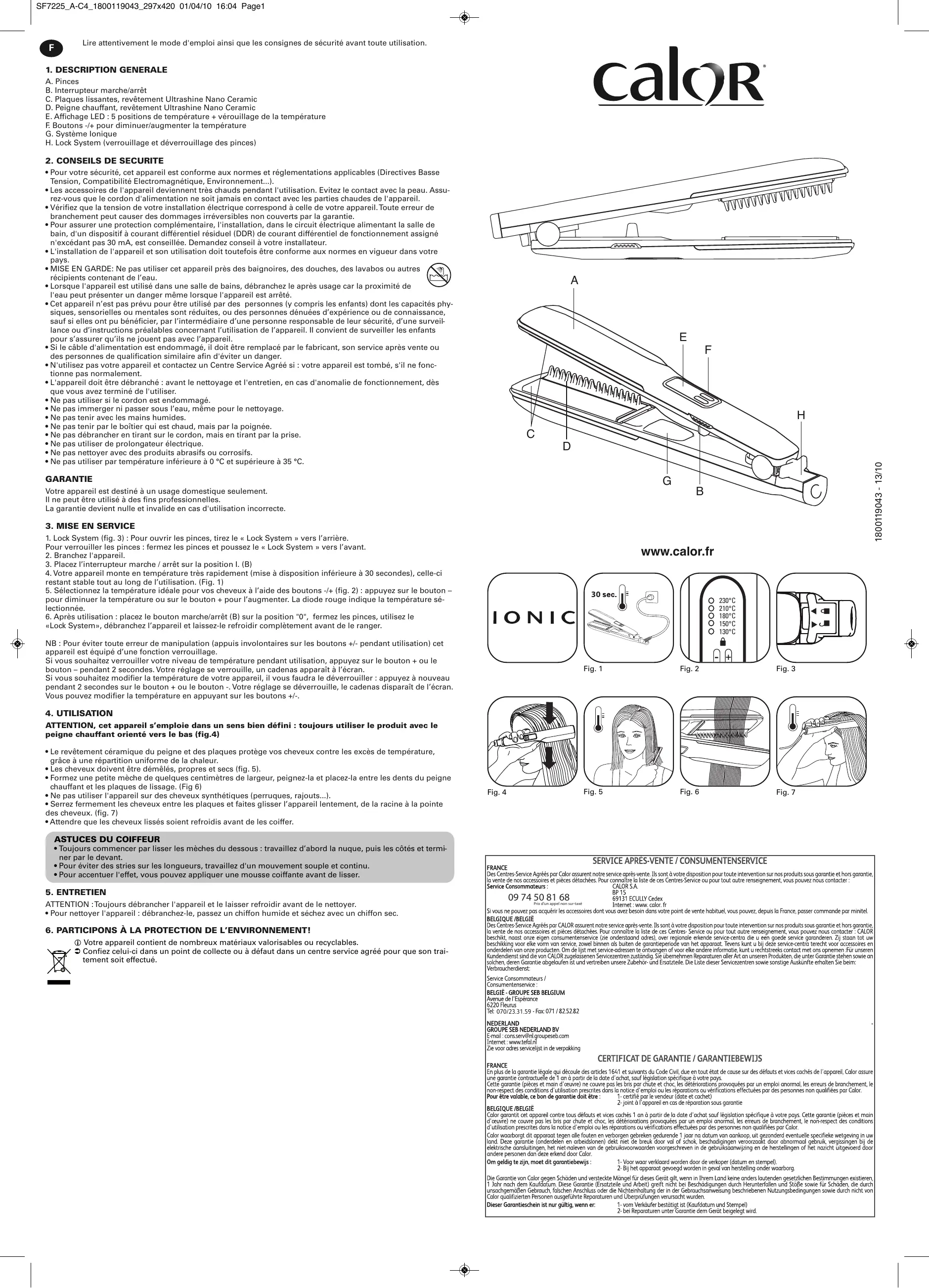 Des Centres-Service Agreés par CALOR assurent notre service après-vente. Ils sont à leur disposition pour toute intervention sur nos produits sous garantie et hors garantie, la vente de nos accessoires et pieces détachéées. Pour connaître la liste de ces Centres-Service ou pour tout autre renseignement, vous pouvez nous contacter : CALOR beschikt, naast onceeur consumentenservice (zie understands adries), over regionale erkende service-centra die u een goede service garanderen. Zij staan tot uw beschikkig voor elkveorm van opem, zowel binnen als buiten de garantiepiode van het apparaat. Tevens kutn u bij desservice-centra terecht voor accessoires en onderdenel van onsPHONEOM de lijst met service-adressen te ontvangen of voel he andere informatie, kunt urechtstreeks contact met ons opemnen: Fur unseren Kundendienst sind die von CALOR zugelassenen Servicezentren zustandig. Sie übernehmer Reparaturel aler Art an unseren Produktien, die unter Garantie sthen sowie an solchen, deren Garantie abgelaufen ist und vertreiben unsere Zubeho-/ und Ersatzteile. Die Liste dieser Servicezentren sowie sonstige Auskunft erhalten Sie beim: Verbraucherdienst: