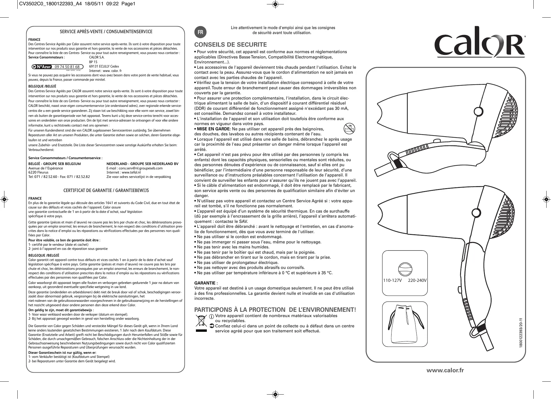 Des Centres-Service Agreés par CALOR assurent notre service après-vente. Ils sont à leur disposition pour toute intervention sur nos produits sous garantie et hors garantie, la vente de nos accessoires et pieces détachées. Pour connaître la liste de ces Centres- Service ou pour tout autre renseignement, vous pouvez nous contacter : CALOR beschikt, naast onceeigen consumentenservice (zie onderstaand adres), over regionale erkende service-centra die u een goede service garanderen. Zij staan tot uw Beschikking voor elkveorm van service, zowel binnen als buiten de garantieperiode van het apparaat. Tevens kunt u bij deze service-centra terecht voor accessoires en onderdelen van onsze producten. Om de lijst met service-adressen te ontvangen o voor elkveere andere informatiage, kunt u rechtsstrecks contact met ons opnemen :