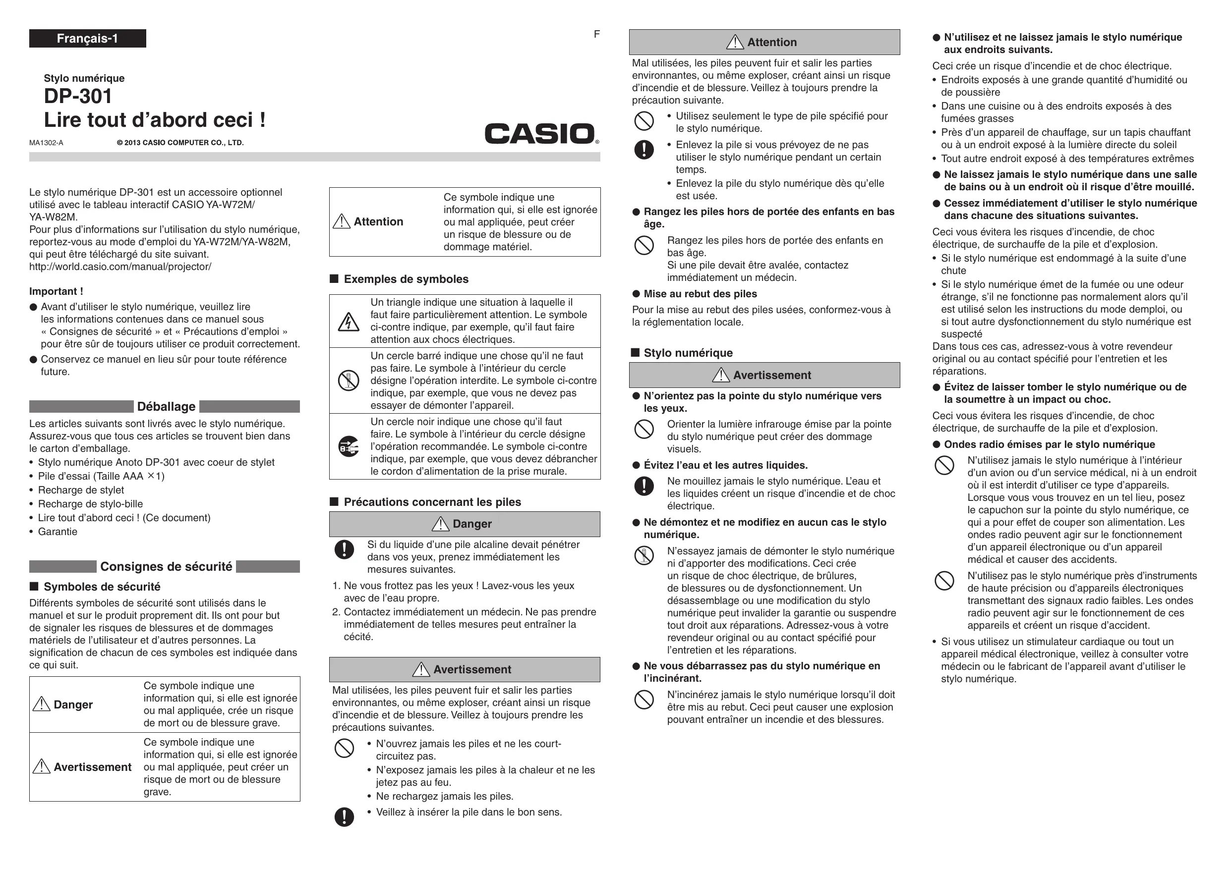 - Avant d'utiliser le stylo numérique, veuillez lire les informations contenues dans ce manuel sous. « Consignes de sécurité » et « Précautions d'emploi » pour être sûr de utiliser ce produit correctement.