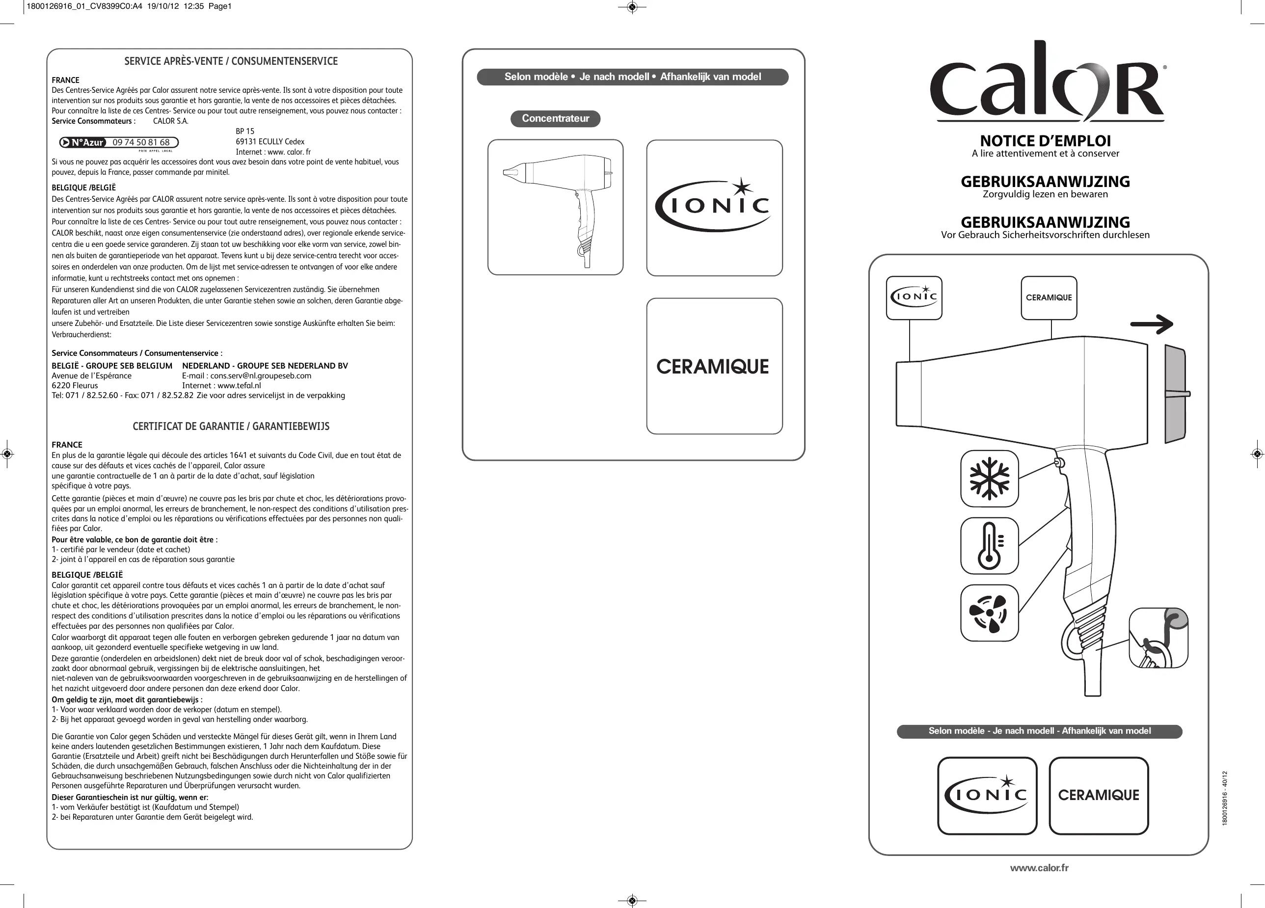 FRANCE Des Centres-Service Agréés par Calor assurent notre service après-vente. Ils sont à votre disposition pour toute intervention sur nos produits sous garantie et hors garantie, la vente de nos accessoires et pièces détachées. Pour connaître la liste de ces Centres- Service ou pour tout autre renseignement, vous pouvez nous contacter : Service Consommateurs : CALOR S.A. BP 15 69131 ECULLY Cedex Internet : www. calor. fr Si vous ne pouvez pas acquérir les accessoires dont vous avez besoin dans votre point de vente habituel, vous pouvez, depuis la France, passer commande par minitel. Selon modèle • Je nach modell • Afhankelijk van model Concentrateur