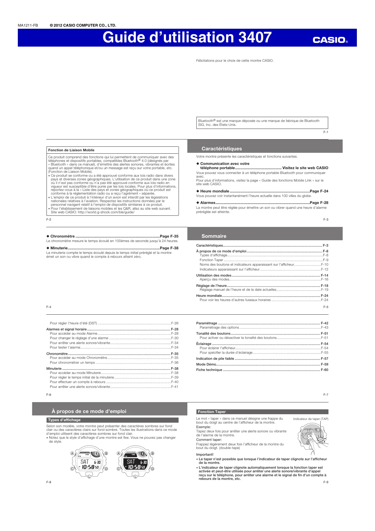 MA1211-FB Ú #!3)/ #/-054%2 #/ ,4$ Guide d’utilisation 3407 Félicitations pour le choix de cette montre CASIO. Bluetooth® est une marque déposée ou une marque de fabrique de Bluetooth SIG, Inc. des États-Unis. F-1 Caractéristiques Fonction de Liaison Mobile Ce produit comprend des fonctions qui lui permettent de communiquer avec des téléphones et dispositifs portables, compatibles Bluetooth® 4.0 (désignés par « Bluetooth » dans ce manuel), d’émettre des alertes sonores, vibrantes et écrites quand un appel téléphonique et/ou un message est reçu sur votre portable, etc. (Fonction de Liaison Mobile). x Ce produit se conforme ou a été approuvé conforme aux lois radio dans divers pays et diverses zones géographiques. L’utilisation de ce produit dans une zone où il n’est pas conforme ou n’a pas été approuvé conforme aux lois radio en vigueur est susceptible d’être punie par les lois locales. Pour plus d’informations, reportez-vous à la « Liste des pays et zones géographiques où ce produit est conforme à la réglementation radio ou a reçu l’agrément » séparée. x L’emploi de ce produit à l’intérieur d’un avion est interdit par les législations nationales relatives à l’aviation. Respectez les instructions données par le personnel navigant relatif à l’emploi de dispositifs similaires à ce produit. x Pour l’établissement de liaisons mobiles et les Q&R, allez au site web suivant. Site web CASIO: http://world.g-shock.com/ble/guide/ Votre montre présente les caractéristiques et fonctions suivantes. ◆ Communication avec votre téléphone portable ........................................... Visitez le site web CASIO Vous pouvez vous connecter à un téléphone portable Bluetooth pour communiquer avec. Pour plus d’informations, visitez la page « Guide des fonctions Mobile Link » sur le site web CASIO. ◆ Heure mondiale ..........................................................................Page F-24 Vous pouvez voir instantanément l’heure actuelle dans 100 villes du globe. ◆ Alarmes .......................................................................................Page F-28 La montre peut être réglée pour émettre un son ou vibrer quand une heure d’alarme préréglée est atteinte. F-2 F-3 ◆ Chronomètre ..............................................................................Page F-35 Sommaire Le chronomètre mesure le temps écoulé en 100èmes de seconde jusqu’à 24 heures. ◆ Minuterie .....................................................................................Page F-38 La minuterie compte le temps écoulé depuis le temps initial préréglé et la montre émet un son ou vibre quand le compte à rebours atteint zéro. Caractéristiques.................................................................................................... F-3 À propos de ce mode d’emploi ............................................................................ F-8 Types d’affichage.............................................................................................F-8 Fonction Taper ................................................................................................F-9 Noms des boutons et indicateurs apparaissant sur l’afficheur..........................F-10 Indicateurs apparaissant sur l’afficheur ...........................................................F-12 Utilisation des modes ......................................................................................... F-14 Aperçu des modes.........................................................................................F-16 Réglage de l’heure .............................................................................................. F-18 Réglage manuel de l’heure et de la date actuelles ...........................................F-19 Heure mondiale ................................................................................................... F-24 Pour voir les heures d’autres fuseaux horaires ................................................F-24 F-4 F-5 Pour régler l’heure d’été (DST) .......................................................................F-26 Alarmes et signal horaire .................................................................................... F-28 Pour accéder au mode Alarme .......................................................................F-28 Pour changer le réglage d’une alarme ............................................................F-30 Pour arrêter une alerte sonore/vibrante ...........................................................F-34 Pour tester l’alarme ........................................................................................F-34 Chronomètre ....................................................................................................... F-35 Pour accéder au mode Chronomètre ..............................................................F-35 Pour chronométrer un temps .........................................................................F-36 Minuterie ............................................................................................................. F-38 Pour accéder au mode Minuterie ....................................................................F-38 Pour régler le temps initial de la minuterie .......................................................F-39 Pour effectuer un compte à rebours ...............................................................F-40 Pour arrêter une alerte sonore/vibrante ...........................................................F-41 Paramétrage ....................................................................................................... F-42 Paramétrage des options ...............................................................................F-43 Tonalité des boutons .......................................................................................... F-