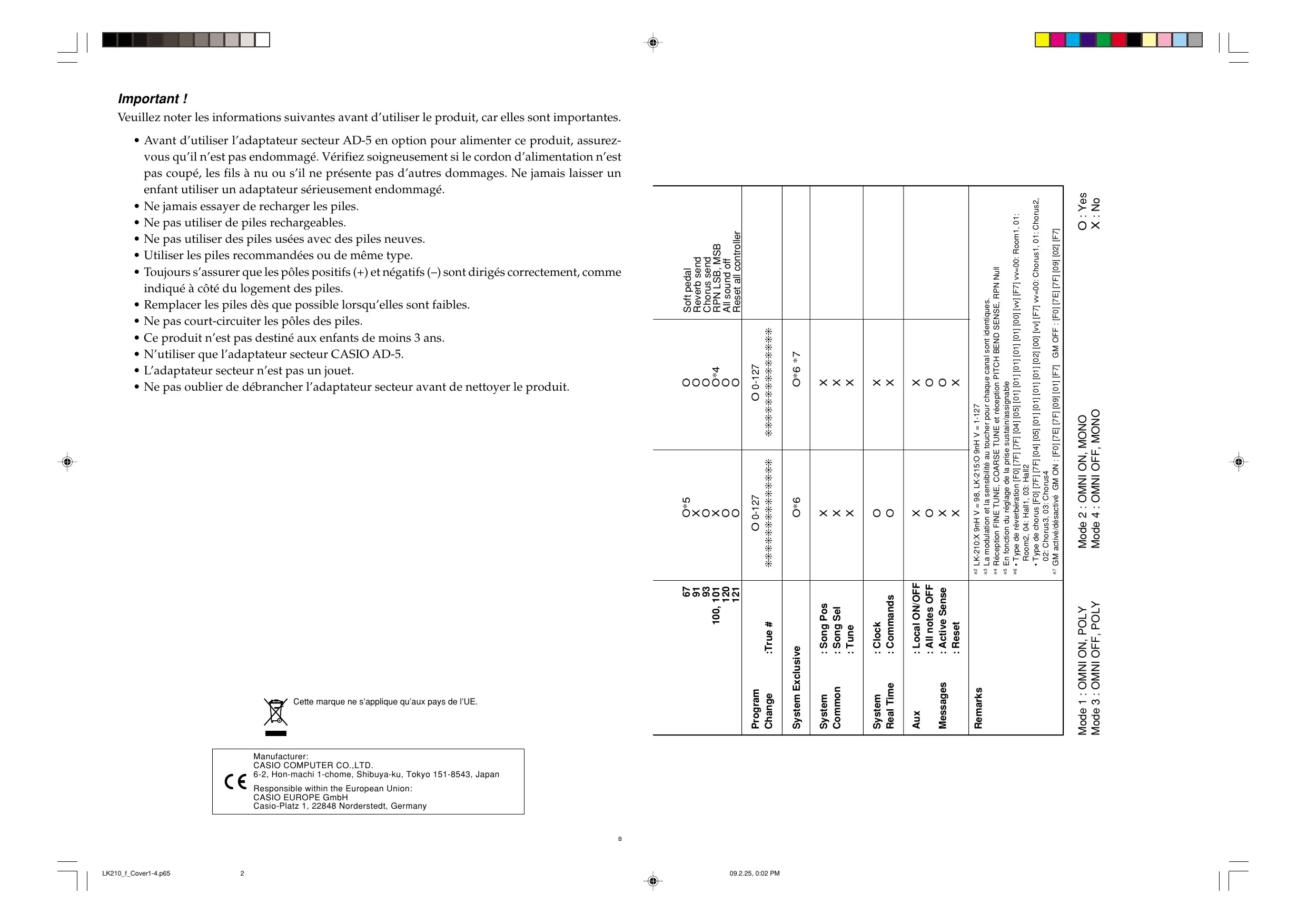 || RRRnT é CESR CE || Important ! Veuillez noter les informations suivantes avant d'utiliser le produit, car elles sont importantes. + Avant d'utiliser l'adaptateur secteur AD-5 en option pour alimenter ce produit, assurez- vous qu’il n’est pas endommagé. Vérifiez soigneusement si le cordon d’alimentation n’est pas coupé, les fils à nu ou s’il ne présente pas d’autres dommages. Ne jamais laisser un O:Yes X : No Mode 2 : OMNI ON, MONO Mode 4 : OMNI OFF, MONO