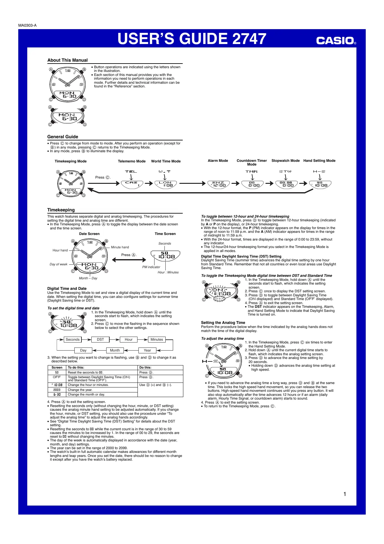 Retrouvez gratuitement la notice de l'appareil 2747 CASIO au format PDF.