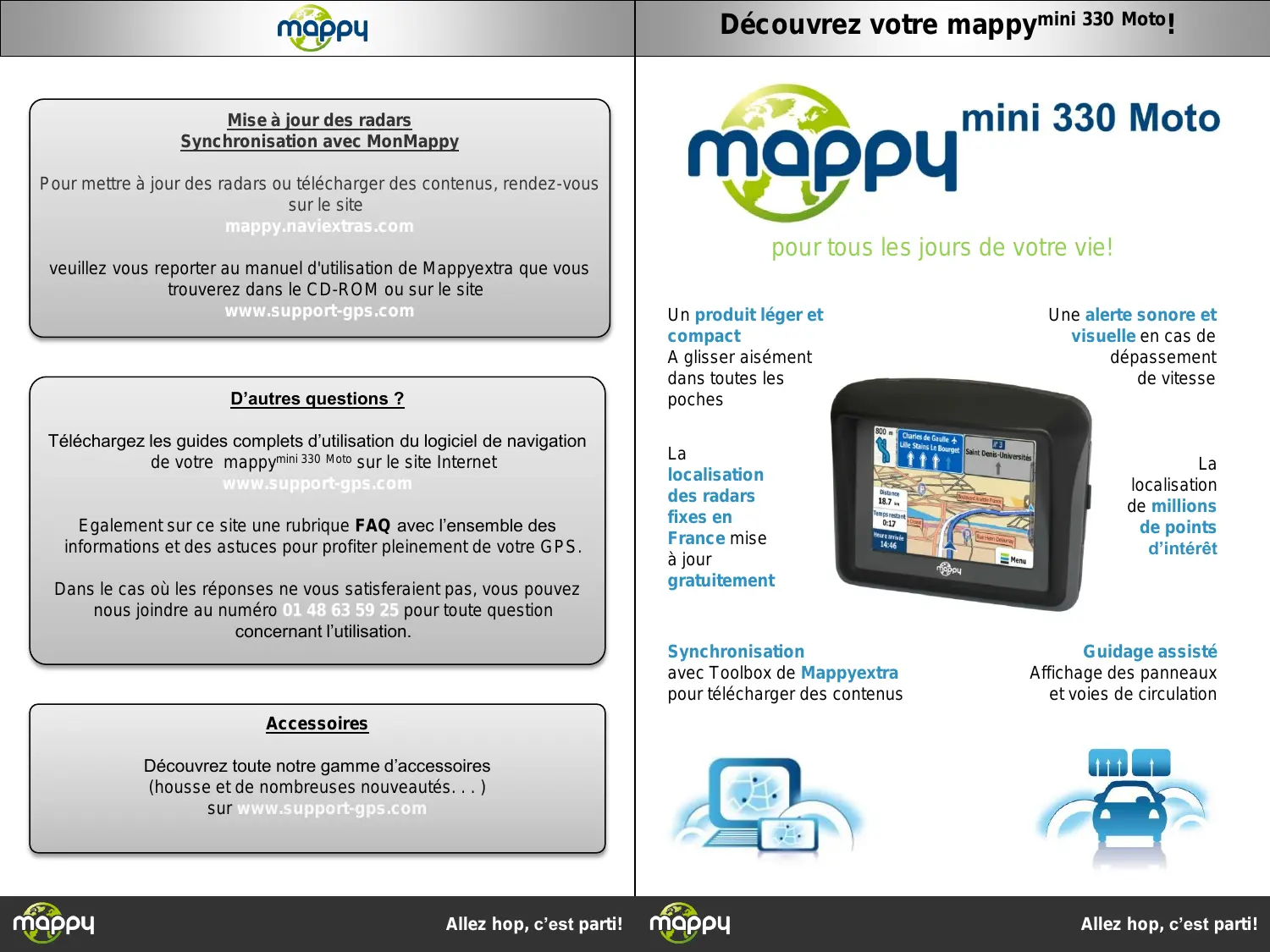 LTD Des 330 Moto Découvrez votre mappy" Mise à jour des radars Synchronisation avec MonMappy Pour mettre à jour des radars ou télécharger des contenus, rendez-vous sur le site veuillez vous reporter au manuel d'utilisation de Mappyextra que vous trouverez dans le CD-ROM ou sur le site D’autres questions ? Téléchargez les guides complets d'utilisation du logiciel de navigation de votre mappymini330 Mot sur le site Internet Egalement sur ce site une rubrique FAQ avec l'ensemble des informations et des astuces pour profiter pleinement de votre GPS. Dans le cas où les réponses ne vous satisferaient pas, vous pouvez nous joindre au numéro pour toute question concernant l’utilisation. Accessoires Découvrez toute notre gamme d'accessoires (housse et de nombreuses nouveautés...) sur seu pour tous les jours de votre vie! mini 330 Moto Une alerte sonore et visuelle en cas de Un produit léger et compact À glisser aisément dépassement dans toutes les de vitesse poches
