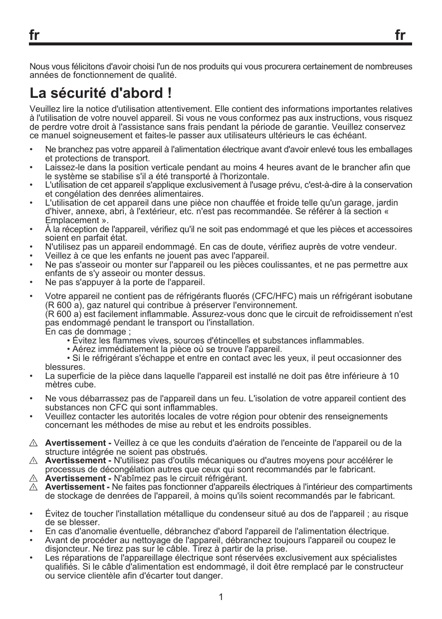 Ne branchez pas votre appareil à l'alimentation électrique avant d'avoir enlevé tous les emballages et protections de transport. Laissez-le dans la position verticale pendant au moins 4 heures avant de le brancher afin que le système se stabilise s'il a été transporté à l'horizontale. L'utilisation de cet appareil s'applique exclusivement à l'usage prévu, c'est-à-dire à la conservation et congélation des denrées alimentaires. L'utilisation de cet appareil dans une pièce non chauffée et froide telle qu'un garage, jardin d'hiver, annexe, abri, à l'extérieur, etc. n'est pas recommandée. Se référer à la section « Emplacement ». À la réception de l'appareil, vérifiez qu'il ne soit pas endommagé et que les pièces et accessoires soient en parfait état. N'utilisez pas un appareil endommagé. En cas de doute, vérifiez auprès de votre vendeur. Veillez à ce que les enfants ne jouent pas avec l'appareil. Ne pas s'asseoir ou monter sur l'appareil ou les pièces coulissantes, et ne pas permettre aux enfants de s'y asseoir ou monter dessus. Ne pas s'appuyer à la porte de l'appareil. Votre appareil ne contient pas de réfrigérants fluorés (CFC/HFC) mais un réfrigérant isobutane (R 600 a), gaz naturel qui contribue à préserver l'environnement. (R 600 a) est facilement inflammable. Assurez-vous donc que le circuit de refroidissement n'est pas endommagé pendant le transport ou l'installation. En cas de dommage ;