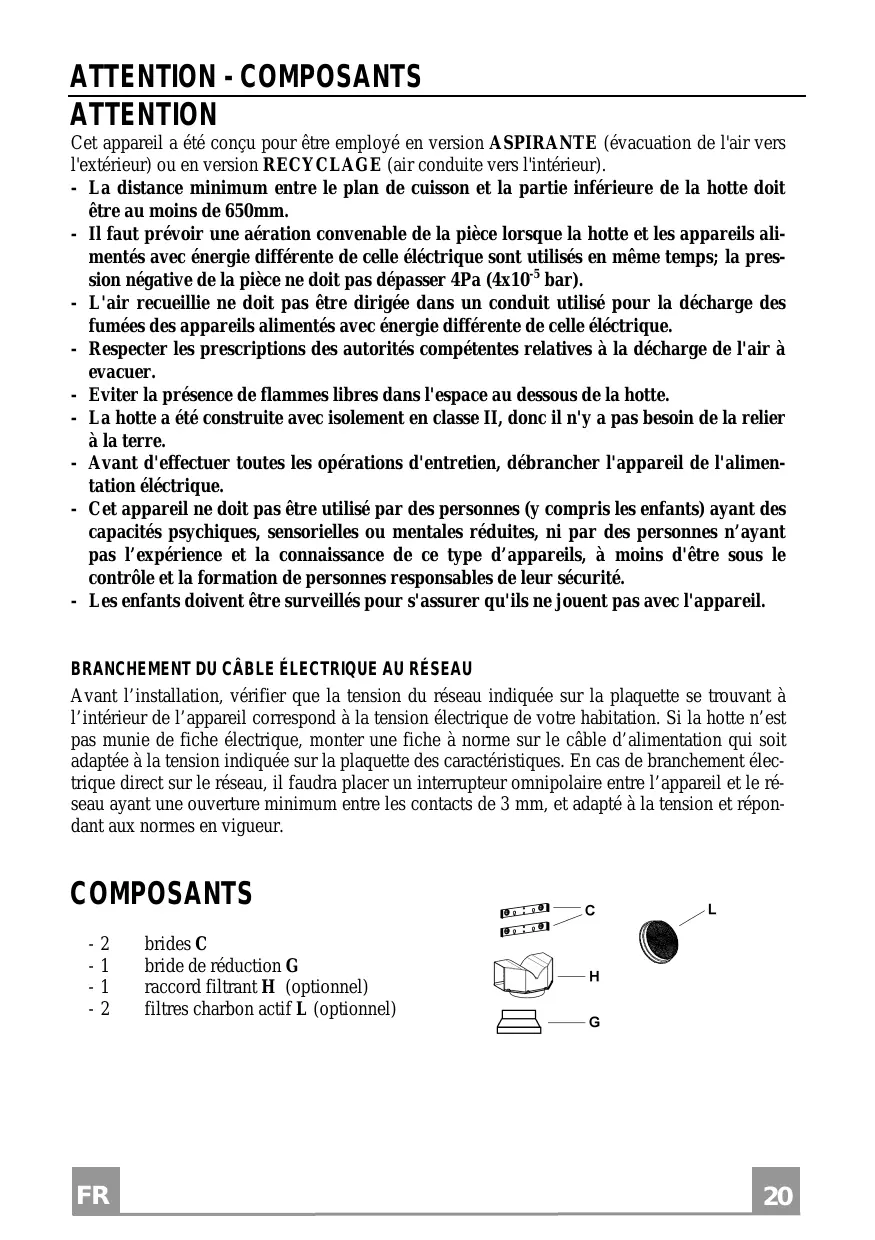 ATTENTION Cet appareil a été conçu pour être employé en version ASPIRANTE (évacuation de l'air vers l'extérieur) ou en version RECYCLAGE (air conduite vers l'intérieur). - La distance minimum entre le plan de cuisson et la partie inférieure de la hotte doit être au moins de 650mm. - Il faut prévoir une aération convenable de la pièce lorsque la hotte et les appareils alimentés avec énergie différente de celle éléctrique sont utilisés en même temps; la pression négative de la pièce ne doit pas dépasser 4Pa (4x10-5 bar). - L'air recueillie ne doit pas être dirigée dans un conduit utilisé pour la décharge des fumées des appareils alimentés avec énergie différente de celle éléctrique. - Respecter les prescriptions des autorités compétentes relatives à la décharge de l'air à evacuer. - Eviter la présence de flammes libres dans l'espace au dessous de la hotte. - La hotte a été construite avec isolement en classe II, donc il n'y a pas besoin de la relier à la terre. - Avant d'effectuer toutes les opérations d'entretien, débrancher l'appareil de l'alimentation éléctrique. - Cet appareil ne doit pas être utilisé par des personnes (y compris les enfants) ayant des capacités psychiques, sensorielles ou mentales réduites, ni par des personnes n’ayant pas l’expérience et la connaissance de ce type d’appareils, à moins d'être sous le contrôle et la formation de personnes responsables de leur sécurité. - Les enfants doivent être surveillés pour s'assurer qu'ils ne jouent pas avec l'appareil. BRANCHEMENT DU CÂBLE ÉLECTRIQUE AU RÉSEAU Avant l’installation, vérifier que la tension du réseau indiquée sur la plaquette se trouvant à l’intérieur de l’appareil correspond à la tension électrique de votre habitation. Si la hotte n’est pas munie de fiche électrique, monter une fiche à norme sur le câble d’alimentation qui soit adaptée à la tension indiquée sur la plaquette des caractéristiques. En cas de branchement électrique direct sur le réseau, il faudra placer un interrupteur omnipolaire entre l’appareil et le réseau ayant une ouverture minimum entre les contacts de 3 mm, et adapté à la tension et répondant aux normes en vigueur. COMPOSANTS