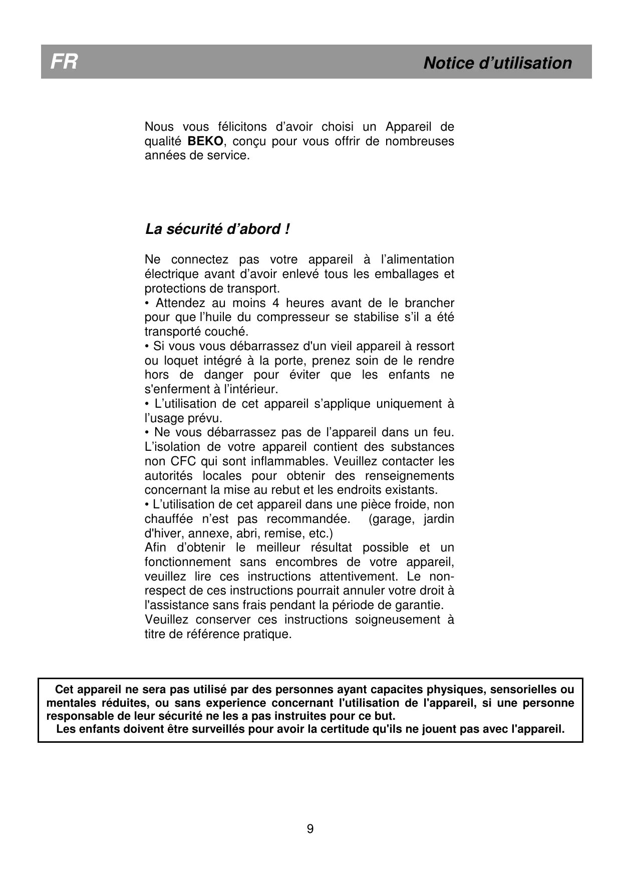 Notice d’utilisation Nous vous félicitons d’avoir choisi un Appareil de qualité BEKO, conçu pour vous offrir de nombreuses années de service. La sécurité d’abord ! Ne connectez pas votre appareil à l’alimentation électrique avant d’avoir enlevé tous les emballages et protections de transport.
