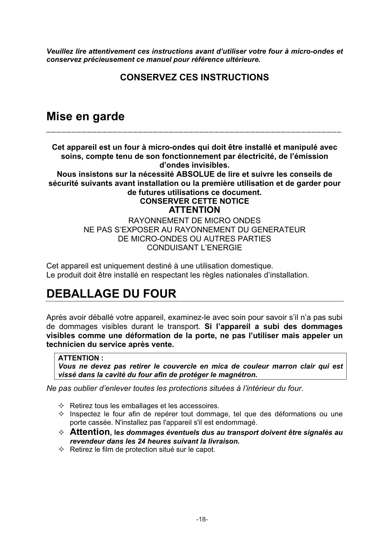 Mise en garde Cet appareil est un four à micro-ondes qui doit être installé et manipulé avec soins, compte tenu de son fonctionnement par électricité, de l’émission d’ondes invisibles. Nous insistons sur la nécessité ABSOLUE de lire et suivre les conseils de sécurité suivants avant installation ou la première utilisation et de garder pour de futures utilisations ce document.