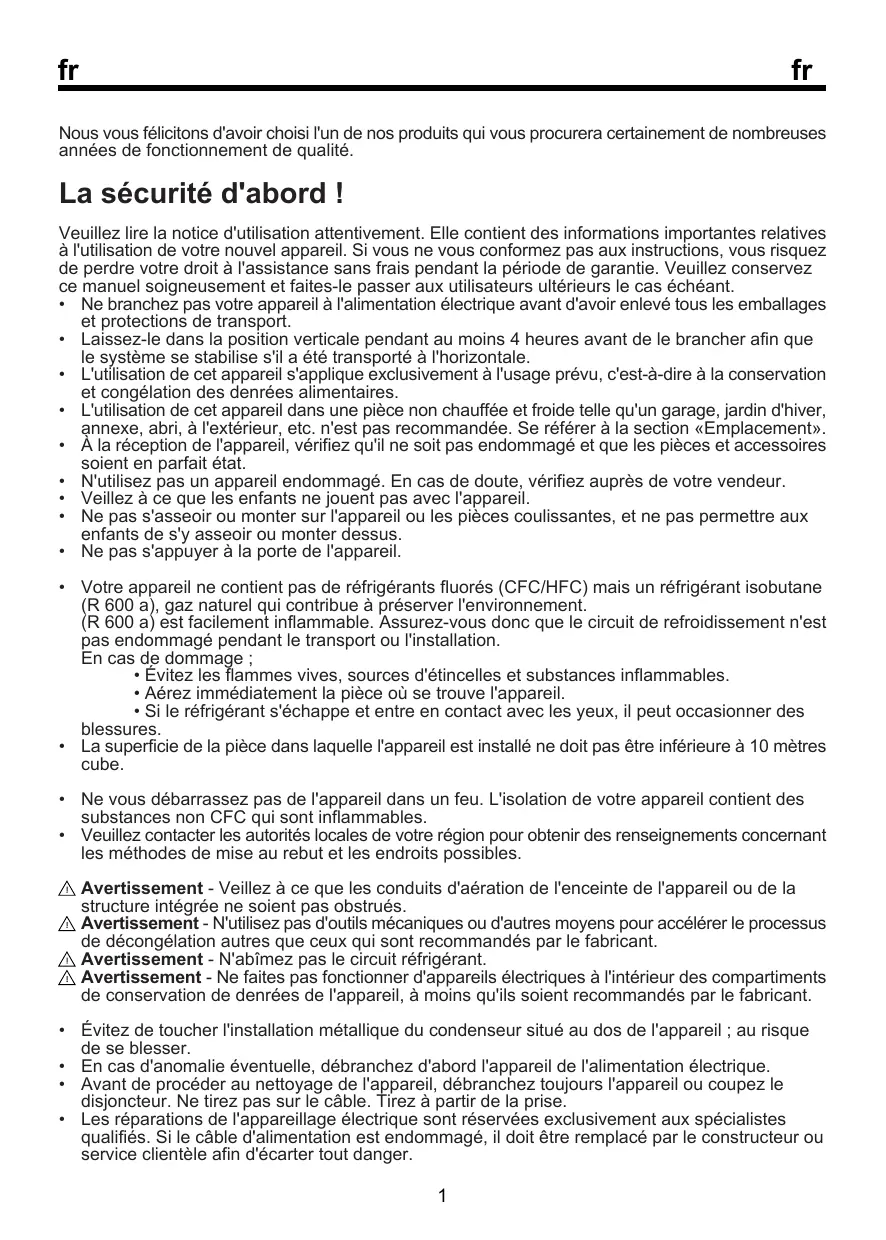 - Ne faites pas fonctionner votre appareil dans un local dont la température peut descendre en dessous de 10 °C la nuit etfou particulièrement en hiver. En cas de températures inférieures, l'appareil peut ne pas fonctionner correctement et réduire ainsi la durée de conservation des denrées.