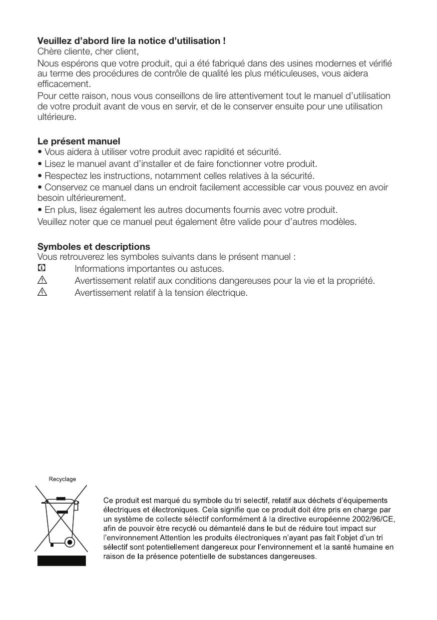 EN Veuillez d’abord lire la notice d’utilisation ! Chère cliente, cher client, Nous espérons que votre produit, qui a été fabriqué dans des usines modernes et vérifié au terme des procédures de contrôle de qualité les plus méticuleuses, vous aidera efficacement. Pour cette raison, nous vous conseillons de lire attentivement tout le manuel d’utilisation de votre produit avant de vous en servir, et de le conserver ensuite pour une utilisation ultérieure. Le présent manuel • Vous aidera à utiliser votre produit avec rapidité et sécurité. • Lisez le manuel avant d’installer et de faire fonctionner votre produit. • Respectez les instructions, notamment celles relatives à la sécurité. • Conservez ce manuel dans un endroit facilement accessible car vous pouvez en avoir besoin ultérieurement. • En plus, lisez également les autres documents fournis avec votre produit. Veuillez noter que ce manuel peut également être valide pour d’autres modèles. Symboles et descriptions Vous retrouverez les symboles suivants dans le présent manuel : C Informations importantes ou astuces. A Avertissement relatif aux conditions dangereuses pour la vie et la propriété. B Avertissement relatif à la tension électrique.