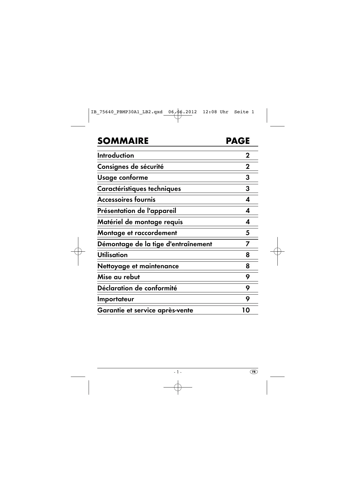 12:08 Uhr Seite 9 Mise au rebut Le produit ne doit jamais être jeté dans la poubelle domestique normale. Remettez l'appareil destiné au recyclage à une entreprise spécialisée ou au centre de recyclage de votre commune. Respectez la réglementation en vigueur. En cas de doutes, contactez votre organisme de recyclage. Eliminez l'ensemble des matériaux d'emballage d'une manière respectueuse de l'environnement. Déclaration de conformité Nous, Kompernaß Handelsgesellschaft GmbH, Burgstraße 21, D-44867 Bochum déclarons sous notre seule responsabilité que le produit correspond à toutes les exigences de la directive sur les machines : 2006/42/EC. Type / Désignation de l’appareil : Embout pompe pour perceuse Powerfix Profi Plus PBMP 30 A1 Numéro de série : IAN 75640 Année de construction : 05/2012 Bochum, le 10.05.2012 Semi Uguzlu, Responsable qualité Importateur KOMPERNASS GMBH BURGSTRASSE 21 44867 BOCHUM, GERMANY www.kompernass.com