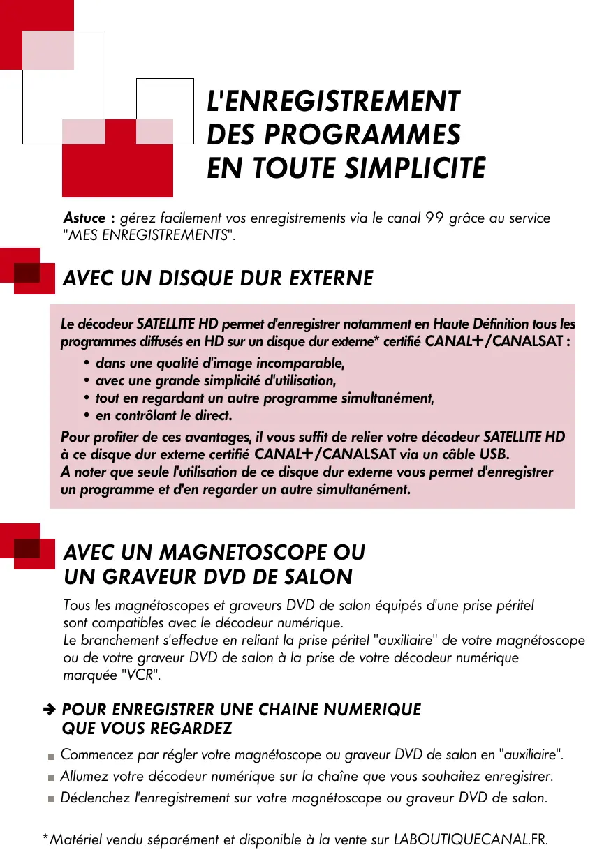 Commencez par régler votre magnétoscope ou graveur DVD de salon en ”auxiliaire”. Allumez votre décodeur numérique sur la chaîne que vous souhaitez enregistrer. Déclenchez l’enregistrement sur votre magnétoscope ou graveur DVD de salon. ≥matériel vendu séparément et disponible à la vente sur LABOUTIQUECANAL.FR. Attention : un décodeur ne peut techniquement décoder qu’une seule chaîne à la fois si vous enregistrez à partir d’un magnétoscope ou d’un graveur de DVD. Ceci signifie que vous ne pouvez pas enregistrer un programme en numérique tout en regardant un autre programme en numérique.