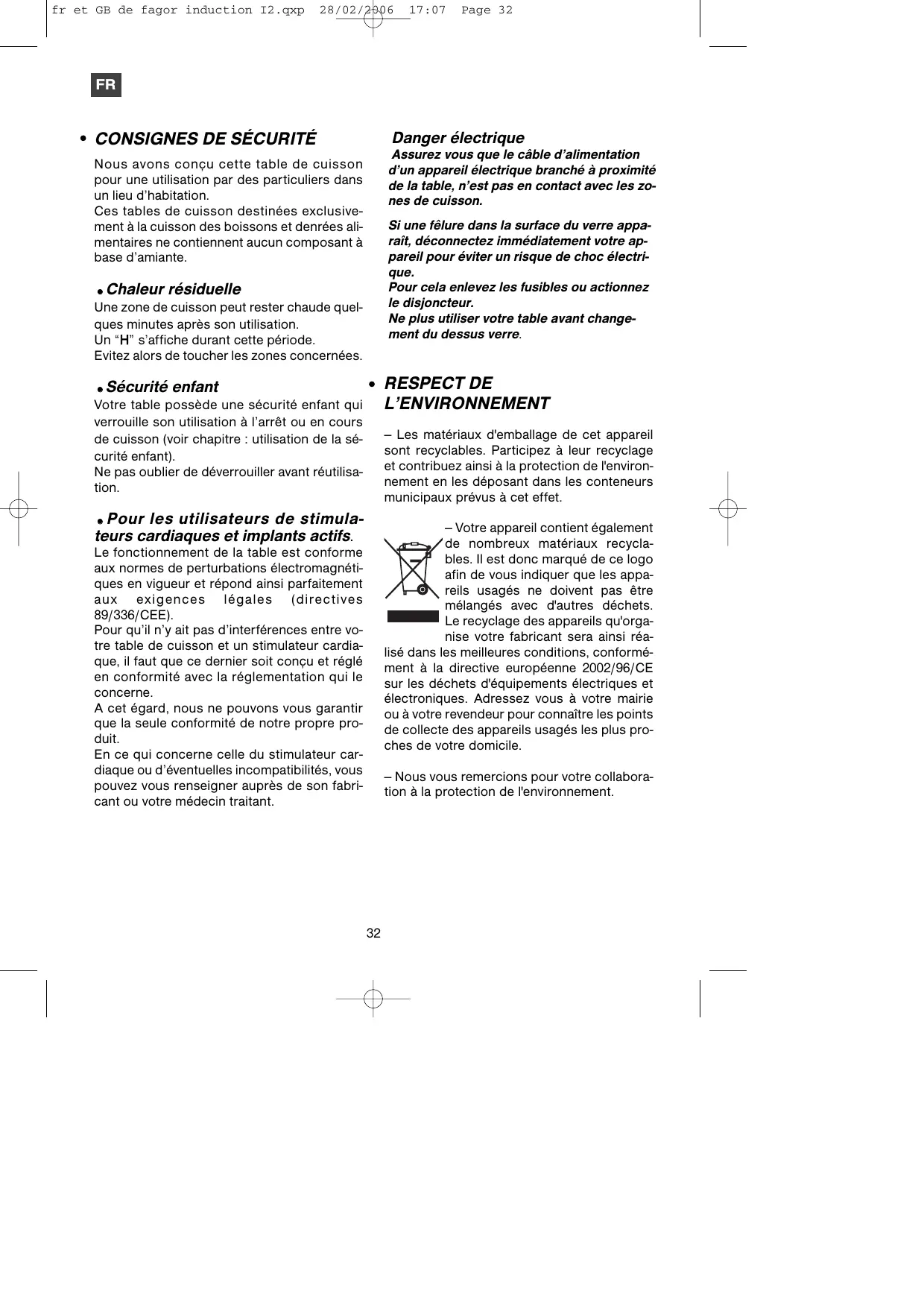 - Pour les utilisateurs de stimulateurs cardiaques et implants actifs. — Votre appareil contient également de nombreux matériaux recyclables. Il est donc marqué de ce logo afin de vous indiquer que les appareils usagés ne doivent pas être mélangés avec d'autres déchets. Le recyclage des appareils qu'organise votre fabricant sera ainsi réalisé dans les meilleures conditions, conformément à la directive européenne 2002/96/CE sur les déchets d'équipements électriques et électroniques. Adressez vous à votre mairie ou à votre revendeur pour connaître les points de collecte des appareils usagés les plus proches de votre domicile. Le fonctionnement de la table est conforme aux normes de perturbations électromagnétiques en vigueur et répond ainsi parfaitement aux exigences légales (directives 89/336/CEE). Pour qu’il n’y ait pas d’interférences entre votre table de cuisson et un stimulateur cardiaque, il faut que ce dernier soit conçu et réglé en conformité avec la réglementation qui le concerne. A cet égard, nous ne pouvons vous garantir que la seule conformité de notre propre produit. En ce qui concerne celle du stimulateur cardiaque ou d’éventuelles incompatibilités, vous pouvez vous renseigner auprès de son fabricant ou votre médecin traitant. — Nous vous remercions pour votre collaboration à la protection de l'environnement.