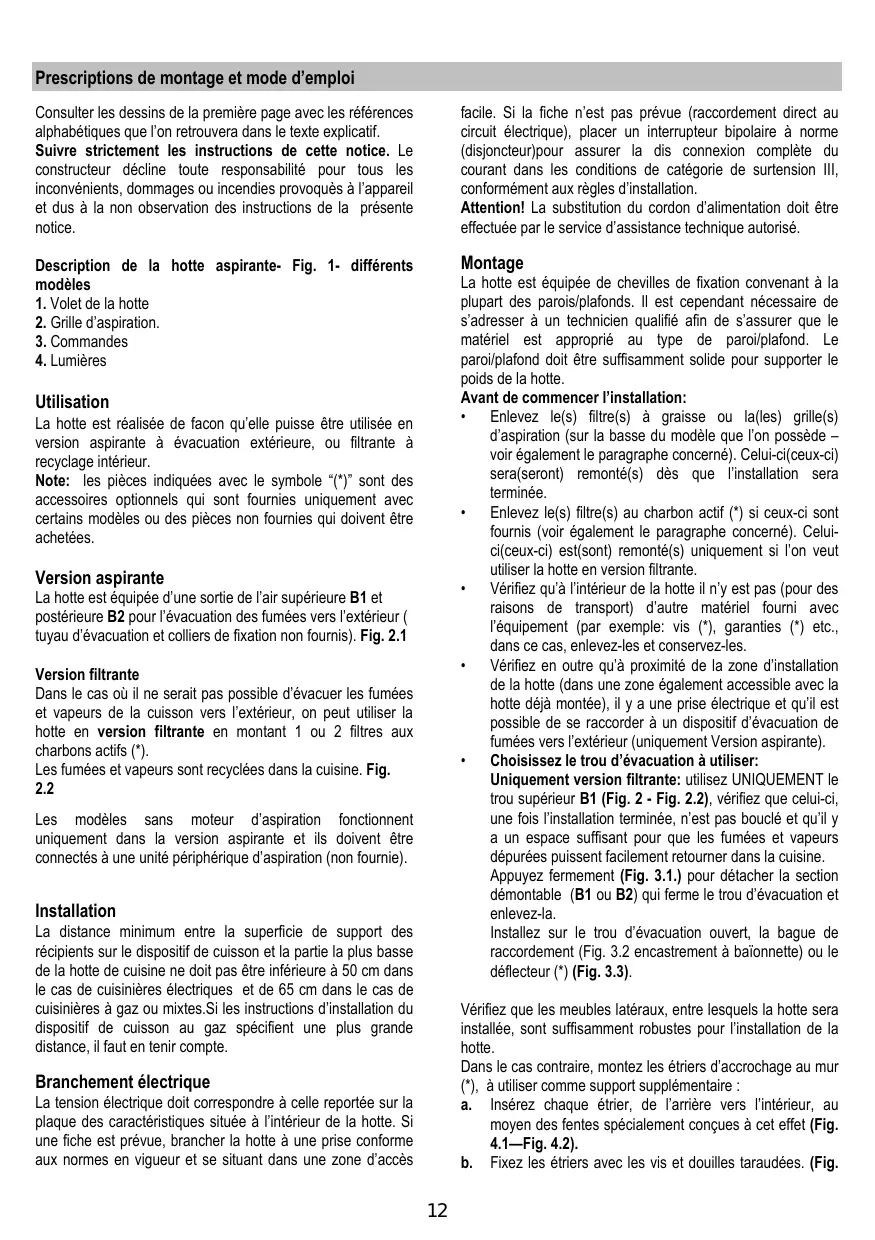 - Choisissez le trou d’évacuation à utiliser: Uniquement version filtrante: utilisez UNIQUEMENT le trou supérieur B1 (Fig. 2 - Fig. 2.2), vérifiez que celui-ci, une fois l’installation terminée, n’est pas bouclé et qu’il y a un espace suffisant pour que les fumées et vapeurs dépurées puissent facilement retourner dans la cuisine. Appuyez fermement (Fig. 3.1.) pour détacher la section démontable (B1 ou B2) qui ferme le trou d’évacuation et enlevez-la. Installez sur le trou d’évacuation ouvert, la bague de raccordement (Fig. 3.2 encastrement à baïonnette) ou le déflecteur (*) (Fig. 3.3). Utilisation La hotte est réalisée de facon qu’elle puisse être utilisée en version aspirante à évacuation extérieure, ou filtrante à recyclage intérieur. Note: les pièces indiquées avec le symbole “(*)” sont des accessoires optionnels qui sont fournies uniquement avec certains modèles ou des pièces non fournies qui doivent être achetées. Version aspirante La hotte est équipée d’une sortie de l’air supérieure B1 et postérieure B2 pour l’évacuation des fumées vers l’extérieur ( tuyau d’évacuation et colliers de fixation non fournis). Fig. 2.1 Version filtrante Dans le cas où il ne serait pas possible d’évacuer les fumées et vapeurs de la cuisson vers l’extérieur, on peut utiliser la hotte en version filtrante en montant 1 ou 2 filtres aux charbons actifs (*). Les fumées et vapeurs sont recyclées dans la cuisine. Fig. Les modèles sans moteur d’aspiration fonctionnent uniquement dans la version aspirante et ils doivent être connectés à une unité périphérique d’aspiration (non fournie). Installation La distance minimum entre la superficie de support des récipients sur le dispositif de cuisson et la partie la plus basse de la hotte de cuisine ne doit pas être inférieure à 50 cm dans le cas de cuisinières électriques et de 65 cm dans le cas de cuisinières à gaz ou mixtes.Si les instructions d’installation du dispositif de cuisson au gaz spécifient une plus grande distance, il faut en tenir compte. Vérifiez que les meubles latéraux, entre lesquels la hotte sera installée, sont suffisamment robustes pour l’installation de la hotte. Dans le cas contraire, montez les étriers d’accrochage au mur (*), à utiliser comme support supplémentaire : a. Insérez chaque étrier, de l’arrière vers l’intérieur, au moyen des fentes spécialement conçues à cet effet (Fig. 4.1—Fig. 4.2). b. Fixez les étriers avec les vis et douilles taraudées. (Fig. Branchement électrique La tension électrique doit correspondre à celle reportée sur la plaque des caractéristiques située à l’intérieur de la hotte. Si une fiche est prévue, brancher la hotte à une prise conforme aux normes en vigueur et se situant dans une zone d’accès