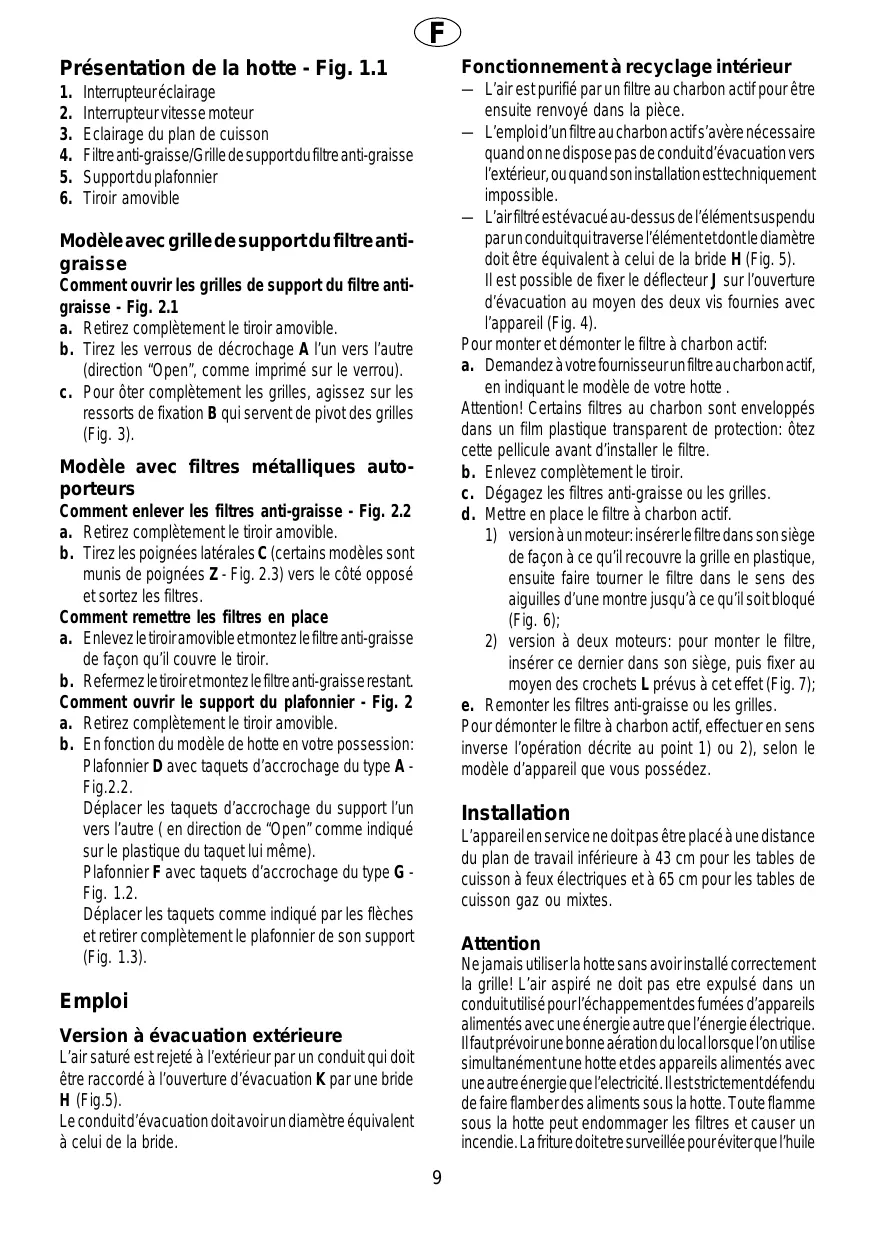 insérer ce dernier dans son siège, puis fixer au moyen des crochets L prévus à cet effet (Fig. 7); e. Remonter les filtres anti-graisse ou les grilles. Pour démonter le filtre à charbon actif, effectuer en sens inverse l’opération décrite au point 1) ou 2), selon le modèle d’appareil que vous possédez. Interrupteur éclairage Interrupteur vitesse moteur Eclairage du plan de cuisson Filtre anti-graisse/Grille de support du filtre anti-graisse Support du plafonnier Tiroir amovible Modèle avec grille de support du filtre antigraisse Comment ouvrir les grilles de support du filtre antigraisse - Fig. 2.1 a. Retirez complètement le tiroir amovible. b. Tirez les verrous de décrochage A l’un vers l’autre (direction “Open”, comme imprimé sur le verrou). c. Pour ôter complètement les grilles, agissez sur les ressorts de fixation B qui servent de pivot des grilles (Fig. 3). Modèle avec filtres métalliques autoporteurs Comment enlever les filtres anti-graisse - Fig. 2.2 a. Retirez complètement le tiroir amovible. b. Tirez les poignées latérales C (certains modèles sont munis de poignées Z - Fig. 2.3) vers le côté opposé et sortez les filtres. Comment remettre les filtres en place a. Enlevez le tiroir amovible et montez le filtre anti-graisse de façon qu’il couvre le tiroir. b. Refermez le tiroir et montez le filtre anti-graisse restant. Comment ouvrir le support du plafonnier - Fig. 2 a. Retirez complètement le tiroir amovible. b. En fonction du modèle de hotte en votre possession: Plafonnier D avec taquets d’accrochage du type A Fig.2.2. Déplacer les taquets d’accrochage du support l’un vers l’autre ( en direction de “Open” comme indiqué sur le plastique du taquet lui même). Plafonnier F avec taquets d’accrochage du type G Fig. 1.2. Déplacer les taquets comme indiqué par les flèches et retirer complètement le plafonnier de son support (Fig. 1.3). Installation L’appareil en service ne doit pas être placé à une distance du plan de travail inférieure à 43 cm pour les tables de cuisson à feux électriques et à 65 cm pour les tables de cuisson gaz ou mixtes. Attention Ne jamais utiliser la hotte sans avoir installé correctement la grille! L’air aspiré ne doit pas etre expulsé dans un conduit utilisé pour l’échappement des fumées d’appareils alimentés avec une énergie autre que l’énergie électrique. Il faut prévoir une bonne aération du local lorsque l’on utilise simultanément une hotte et des appareils alimentés avec une autre énergie que l’electricité. Il est strictement défendu de faire flamber des aliments sous la hotte. Toute flamme sous la hotte peut endommager les filtres et causer un incendie. La friture doit etre surveillée pour éviter que l’huile Emploi Version à évacuation extérieure L’air saturé est rejeté à l’extérieur par un conduit qui doit être raccordé à l’ouverture d’évacuation K par une bride H (Fig.5). Le conduit d’évacuation doit avoir un diamètre équivalent à celui de la bride.