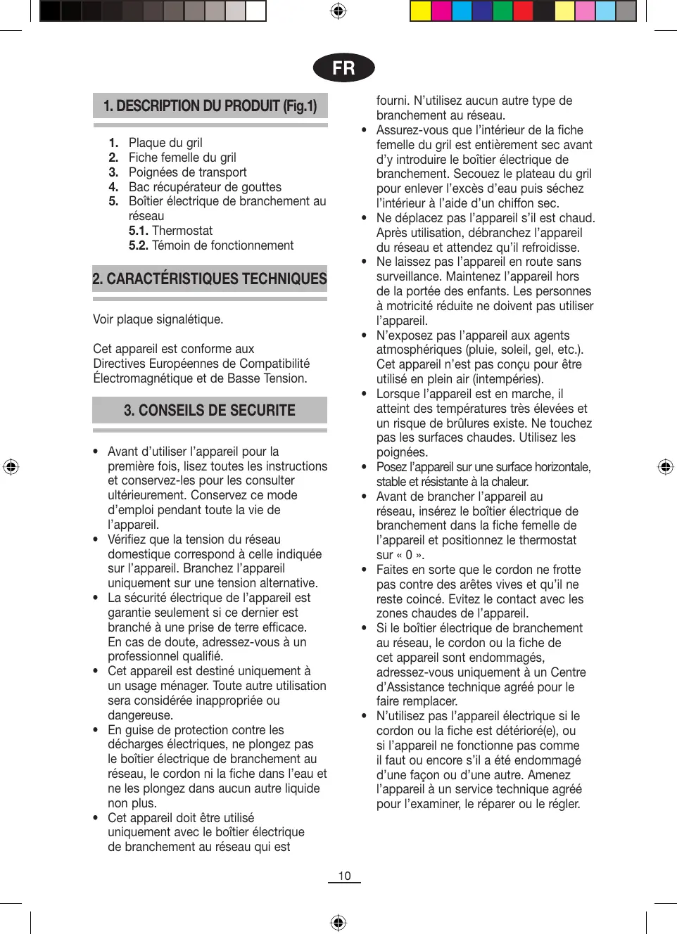 fourni. N’utilisez aucun autre type de branchement au réseau. Assurez-vous que l’intérieur de la fiche femelle du gril est entièrement sec avant d’y introduire le boîtier électrique de branchement. Secouez le plateau du gril pour enlever l’excès d’eau puis séchez l’intérieur à l’aide d’un chiffon sec. Ne déplacez pas l’appareil s’il est chaud. Après utilisation, débranchez l’appareil du réseau et attendez qu’il refroidisse. Ne laissez pas l’appareil en route sans surveillance. Maintenez l’appareil hors de la portée des enfants. Les personnes à motricité réduite ne doivent pas utiliser l’appareil. N’exposez pas l’appareil aux agents atmosphériques (pluie, soleil, gel, etc.). Cet appareil n’est pas conçu pour être utilisé en plein air (intempéries). Lorsque l’appareil est en marche, il atteint des températures très élevées et un risque de brûlures existe. Ne touchez pas les surfaces chaudes. Utilisez les poignées. Posez l’appareil sur une surface horizontale, stable et résistante à la chaleur. Avant de brancher l’appareil au réseau, insérez le boîtier électrique de branchement dans la fiche femelle de l’appareil et positionnez le thermostat sur « 0 ». Faites en sorte que le cordon ne frotte pas contre des arêtes vives et qu’il ne reste coincé. Evitez le contact avec les zones chaudes de l’appareil. Si le boîtier électrique de branchement au réseau, le cordon ou la fiche de cet appareil sont endommagés, adressez-vous uniquement à un Centre d’Assistance technique agréé pour le faire remplacer. N’utilisez pas l’appareil électrique si le cordon ou la fiche est détérioré(e), ou si l’appareil ne fonctionne pas comme il faut ou encore s’il a été endommagé d’une façon ou d’une autre. Amenez l’appareil à un service technique agréé pour l’examiner, le réparer ou le régler.