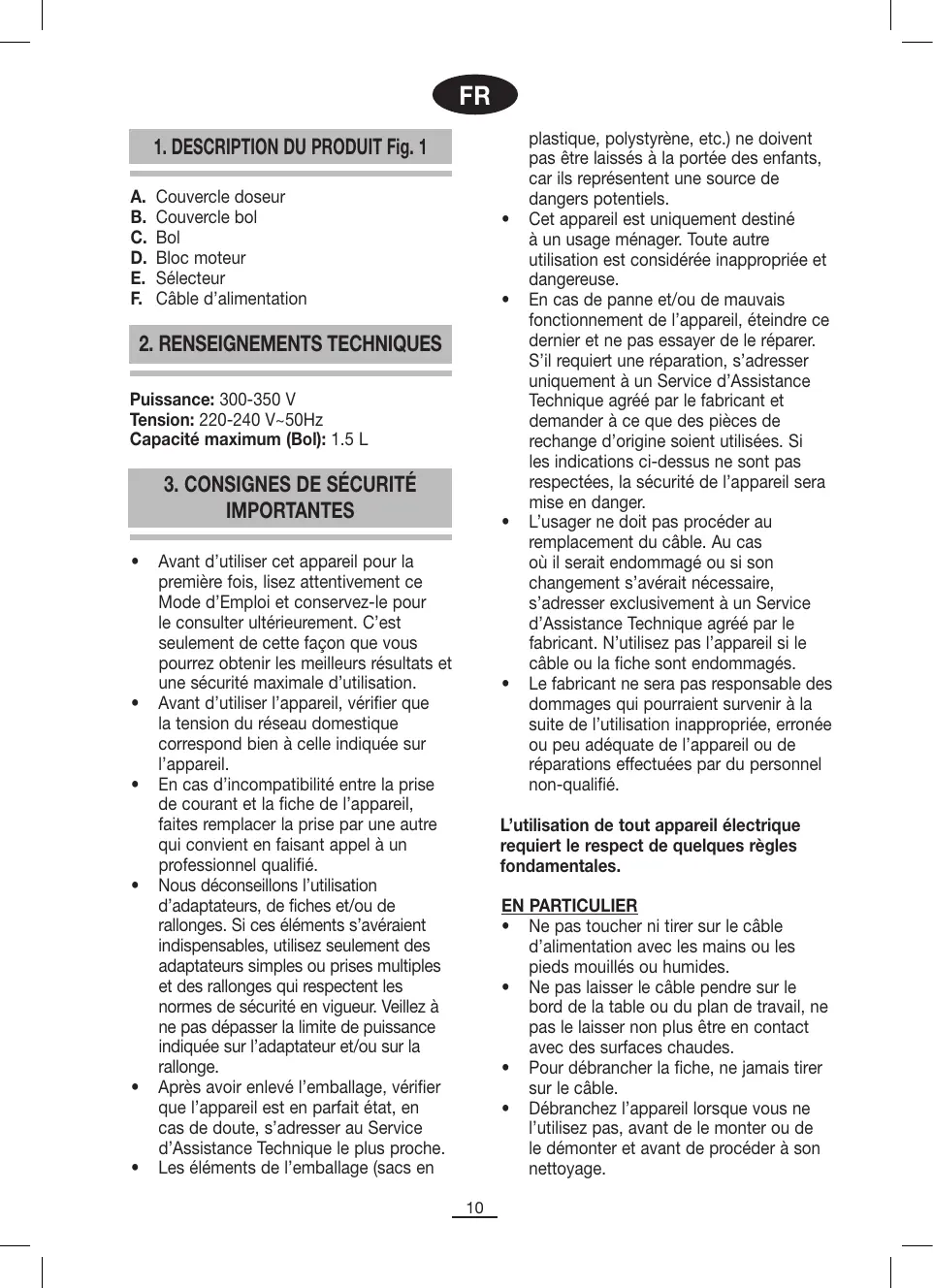plastique, polystyrène, etc.) ne doivent pas être laissés à la portée des enfants, car ils représentent une source de dangers potentiels. Cet appareil est uniquement destiné à un usage ménager. Toute autre utilisation est considérée inappropriée et dangereuse. En cas de panne et/ou de mauvais fonctionnement de l’appareil, éteindre ce dernier et ne pas essayer de le réparer. S’il requiert une réparation, s’adresser uniquement à un Service d’Assistance Technique agréé par le fabricant et demander à ce que des pièces de rechange d’origine soient utilisées. Si les indications ci-dessus ne sont pas respectées, la sécurité de l’appareil sera mise en danger. L’usager ne doit pas procéder au remplacement du câble. Au cas où il serait endommagé ou si son changement s’avérait nécessaire, s’adresser exclusivement à un Service d’Assistance Technique agréé par le fabricant. N’utilisez pas l’appareil si le câble ou la fiche sont endommagés. Le fabricant ne sera pas responsable des dommages qui pourraient survenir à la suite de l’utilisation inappropriée, erronée ou peu adéquate de l’appareil ou de réparations effectuées par du personnel non-qualifié. L’utilisation de tout appareil électrique requiert le respect de quelques règles fondamentales. EN PARTICULIER