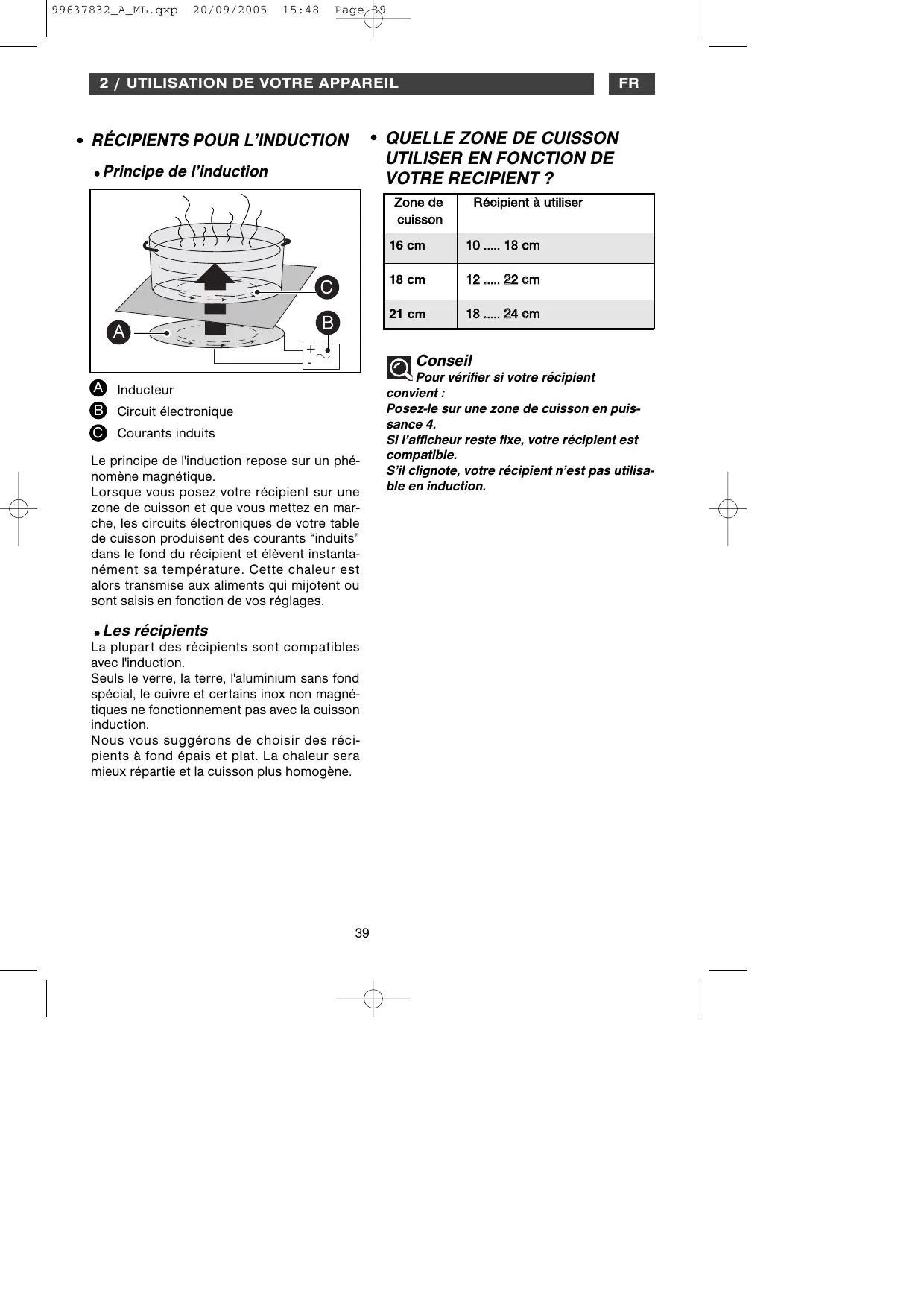 | Après avoir mis en fonctionnement une zone de chauffe, les voyants lumineux du clavier continuant de clignoter. | Le récipient utilisé n'est pas adapté pour l'induction ou est d'un diamètre inférieur à 12 cm (10 cm sur foyer 16 cm). | Voir chapitre récipiens pour l'induction. |