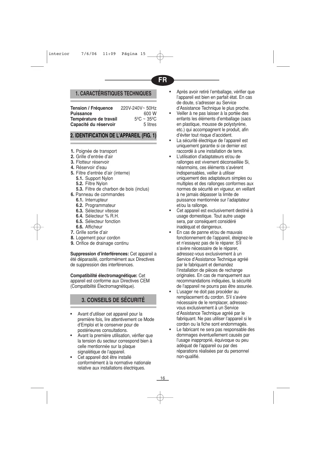 La sécurité électrique de l’appareil est uniquement garantie si ce dernier est raccordé à une installation de terre. L’utilisation d’adaptateurs et/ou de rallonges est vivement déconseillée Si, néanmoins, ces éléments s’avèrent indispensables, veiller à utiliser uniquement des adaptateurs simples ou multiples et des rallonges conformes aux normes de sécurité en vigueur, en veillant à ne jamais dépasser la limite de puissance mentionnée sur l’adaptateur et/ou la rallonge. Cet appareil est exclusivement destiné à usage domestique. Tout autre usage sera, par conséquent considéré inadéquat et dangereux. En cas de panne et/ou de mauvais fonctionnement de l’appareil, éteignez-le et n’essayez pas de le réparer. S’il s’avère nécessaire de le réparer, adressez-vous exclusivement à un Service d’Assistance Technique agréé par le fabriquant et demandez l’installation de pièces de rechange originales. En cas de manquement aux recommandations indiquées, la sécurité de l’appareil ne pourra pas être assurée. L’usager ne doit pas procéder au remplacement du cordon. S’il s’avère nécessaire de le remplacer, adressezvous exclusivement à un Service d’Assistance Technique agréé par le fabriquant. Ne pas utiliser l’appareil si le cordon ou la fiche sont endommagés. Le fabricant ne sera pas responsable des dommages éventuellement causés par l’usage inapproprié, équivoque ou peu adéquat de l’appareil ou par des réparations réalisées par du personnel non-qualifié.