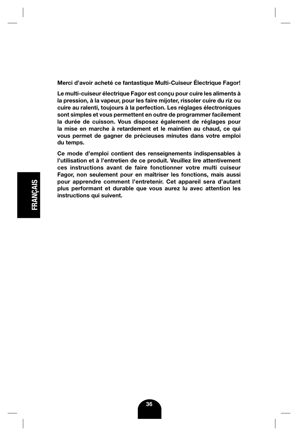 Ce mode d’emploi contient des renseignements indispensables à l’utilisation et à l’entretien de ce produit. Veuillez lire attentivement ces instructions avant de faire fonctionner votre multi cuiseur Fagor, non seulement pour en maîtriser les fonctions, mais aussi pour apprendre comment l’entretenir. Cet appareil sera d’autant plus performant et durable que vous aurez lu avec attention les instructions qui suivent.