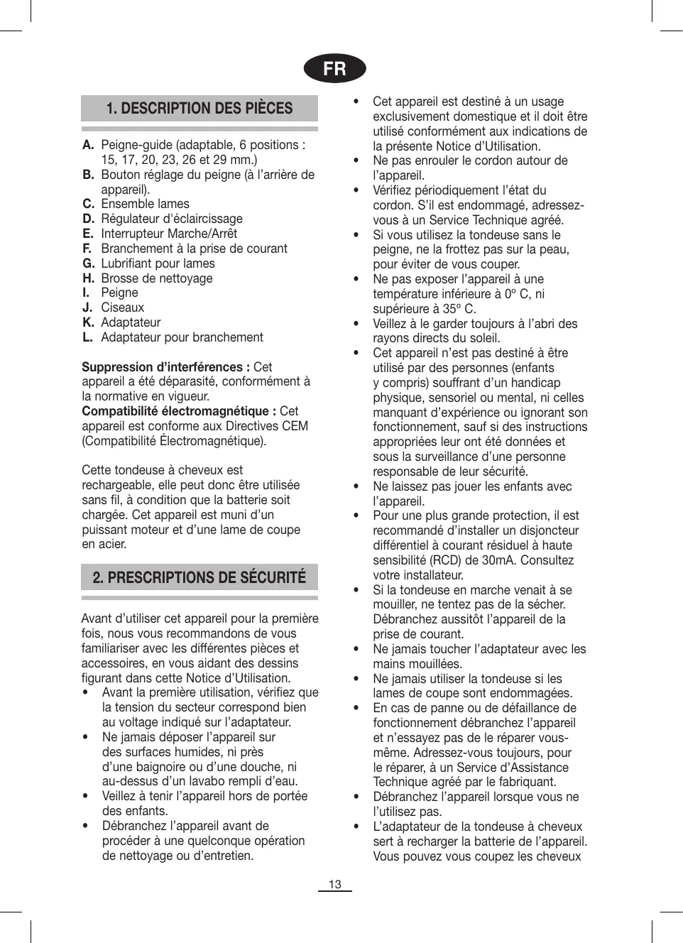 1. DESCRIPTION DES PIÈCES A. Peigne-guide (adaptable, 6 positions : 15, 17, 20, 23, 26 et 29 mm.) B. Bouton réglage du peigne (à l’arrière de appareil). C. Ensemble lames D. Régulateur d'éclaircissage E. Interrupteur Marche/Arrêt F. Branchement à la prise de courant G. Lubrifiant pour lames H. Brosse de nettoyage I. Peigne J. Ciseaux K. Adaptateur L. Adaptateur pour branchement