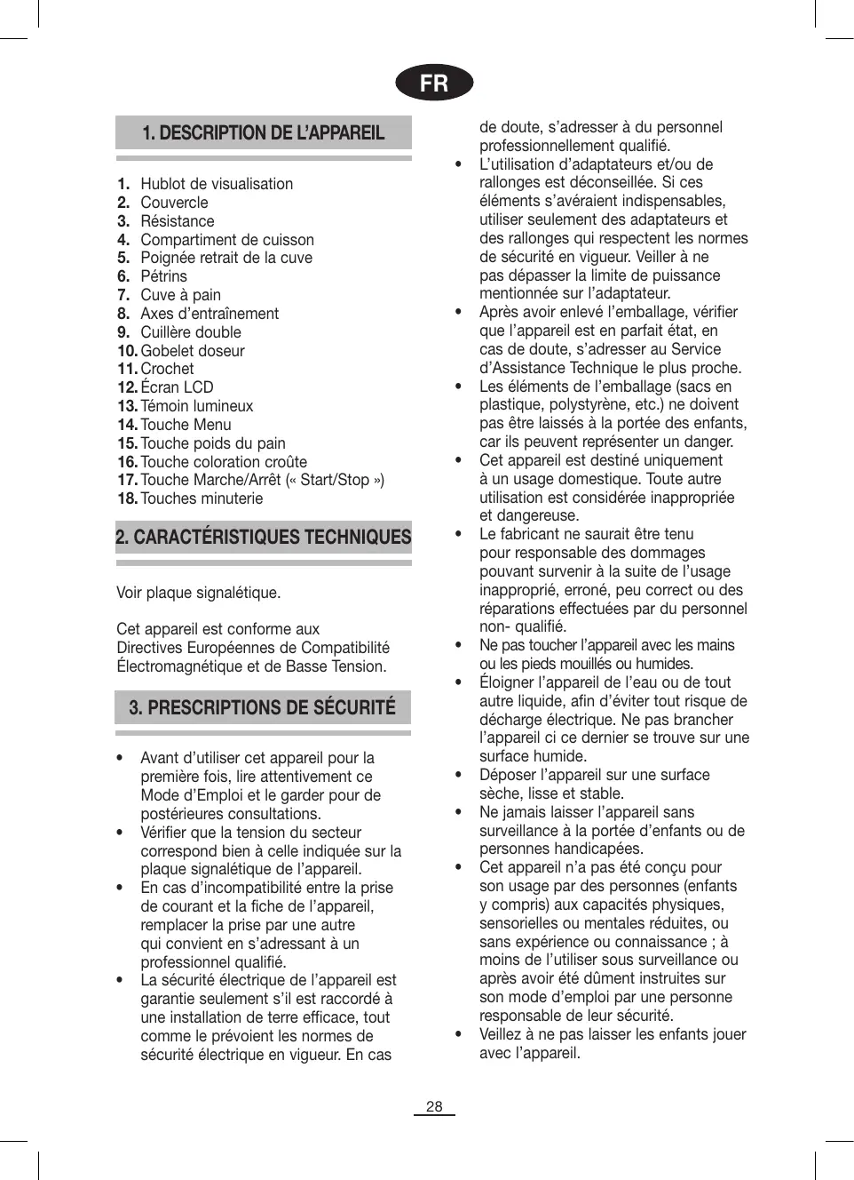 Technique le plus proche, agréé par le fabricant. + Mémoire en cas d'arrêt de courant: La machine dispose d'une 10. ENTRETIEN protection de 6 minutes en cas de panne de courant, ou si l'appareil est débranché par mégarde durant son Antes de procéder à l'entretien de la fonctionnement. Si le courant est rétabli machine à pain, débranchez-la et laissez-la avant la fin de ce délai, le programme refroidir complètement. reprend automatiquement. + Ne plongez pas la machine dans l’eau + Conditions ambiantes: La machine ni dans un quelconque autre liquide. évalue les conditions ambiantes avant + Nettoyez la cuve à pain (7) et les pétrins de faire démarrer un programme. (6), immédiatement après chaque La machine doit être à température utilisation, avec de l'eau additionné de ambiante. Si la température est trop produit de vaisselle. Rincez-les à l'eau élevée (>50°C) ou trop basse (<-10°C), propre et séchez-les soigneusement. l'appareil annulera automatiquement + Nettoyez l'extérieur et l'intérieur de la toutes les fonctions, l'écran affichera machine avec un chiffon doux humide. « E00 » ou « E01 » et un signal sonore +__Ne pas utiliser de détergents ou retentira. Débranchez la machine, produits abrasifs. retirez le pain et attendez que la température ambiante soit de -10°C à 50°C avant de rebrancher la machine. Si l'appareil ne fonctionne toujours pas, adressez-vous au Service d'Assistance Technique le plus proche, agréé par le fabricant. + Fonctionnement incorrect: En cas de défaillance, l'écran affichera « EEE » et la machine émettra un signal sonore. En cas de court-circuit, l'écran affichera <HHH » et la machine fera retentir un signal sonore. Dans les deux cas,