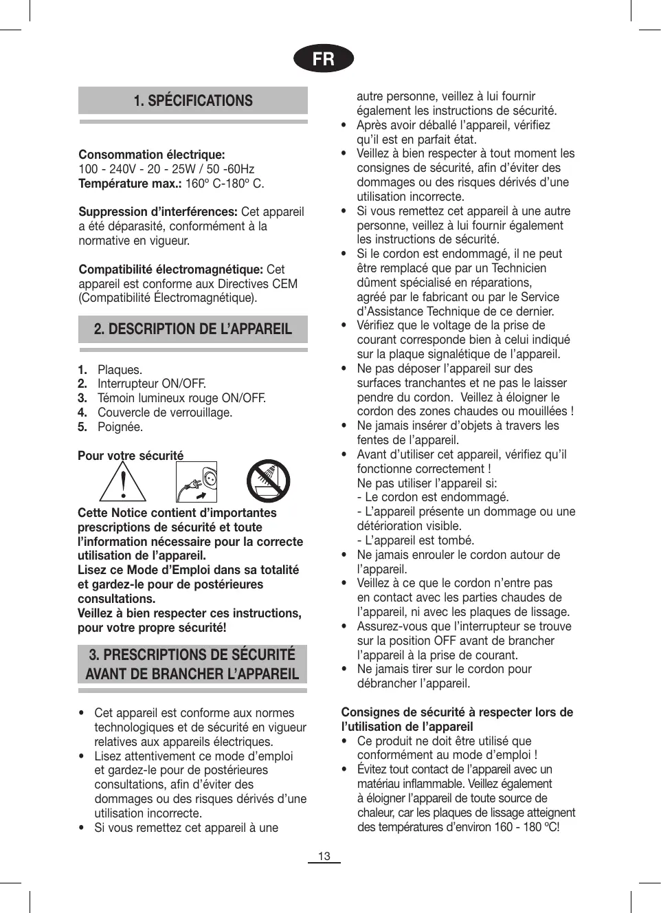 - Cet apparéil a été concu pour un usage exclusivement domestique. Il est destiné uniquement àisser et à coiffer les cheveux humains, conformément au mode d'emploi.