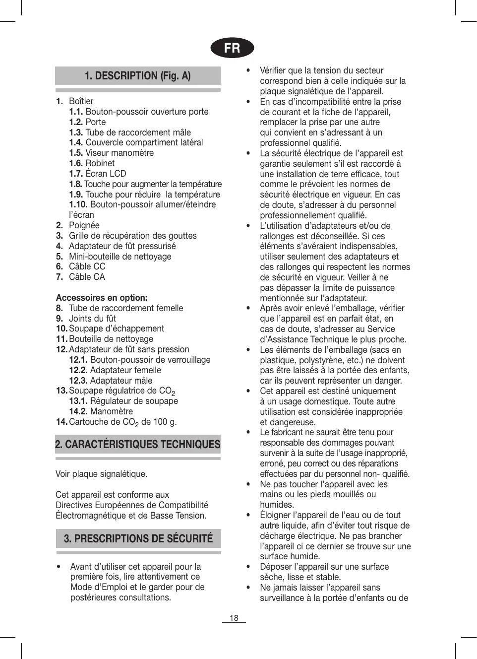 1. Boîtier 1.1. Bouton-poussoir ouverture porte 1.2. Porte 1.3. Tube de raccordement mâle 1.4. Couvercle compartiment latéral 1.5. Viseur manomètre 1.6. Robinet 1.7. Écran LCD 1.8. Touche pour augmenter la température 1.9. Touche pour réduire la température 1.10. Bouton-poussoir allumer/éteindre l’écran 2. Poignée 3. Grille de récupération des gouttes 4. Adaptateur de fût pressurisé 5. Mini-bouteille de nettoyage 6. Câble CC 7. Câble CA