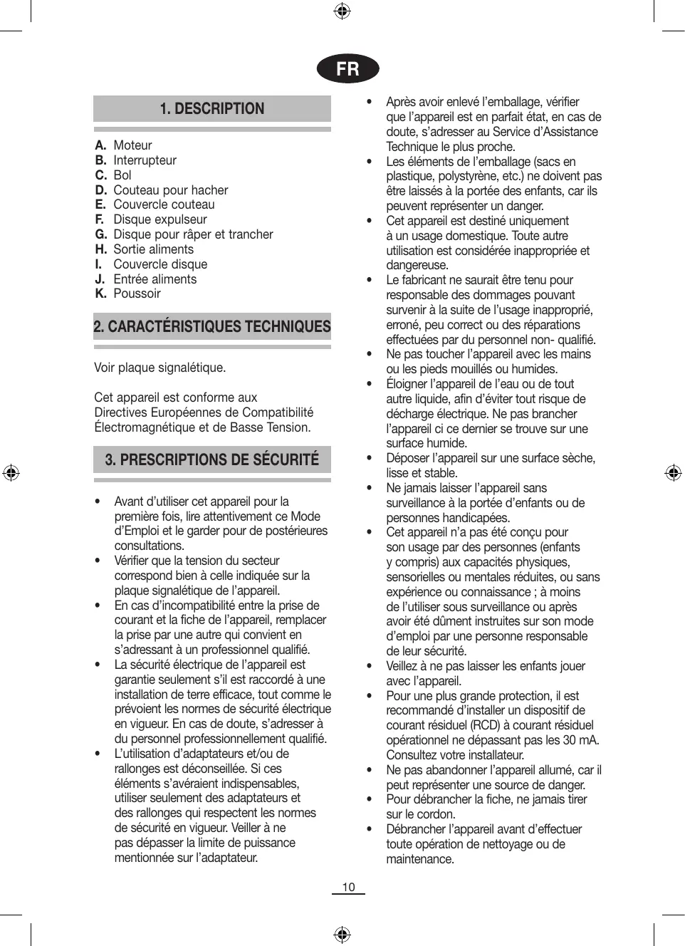 • Técnica autorizado por el fabricante y solicitar el uso de recambios originales. • Si el cable de este aparato resulta dañado, diríjase a un Centro de Asistencia técnico autorizado para que lo sustituyan. • No deje el aparato expuesto a los agentes atmosféricos (lluvia, sol, hielo etc.). • No utilice o coloque ninguna parte de este aparato sobre o cerca de superficies calientes (placas de cocina de gas o eléctrica u hornos). • No utilice detergentes o bayetas abrasivas para limpiar la unidad. • Coloque un recipiente debajo de la boca de salida de alimentos, al trabajar con el disco de rallar y laminar. • No trabaje con la cuchilla o el disco más de 1 minuto cada vez. Después de 1 minuto en funcionamiento, déjelo enfriar 5 minutos. • No intente cortar o trocear alimentos duros, como café, cubitos de hielo, azúcar, arroz, especias, etc. • Retire los huesos y ternillas antes de colocar carne en el vaso. • No corte o ralle alimentos como el queso, tomates, limones, dátiles, melocotones o alimentos congelados. 5. Pulse el interruptor (B) y presione los alimentos lentamente con la pieza de empuje (K) (fig. 7). 6. El aparato permanecerá en funcionamiento durante el tiempo que tenga presionado el interruptor. 7. Retire la tapa de disco (I) solo cuando los discos de rallar y laminar hayan dejado de girar. 8. Desenchufe el aparato EN 1. DESCRIPTION A. B. C. D. Électromagnétique et de Basse Tension.