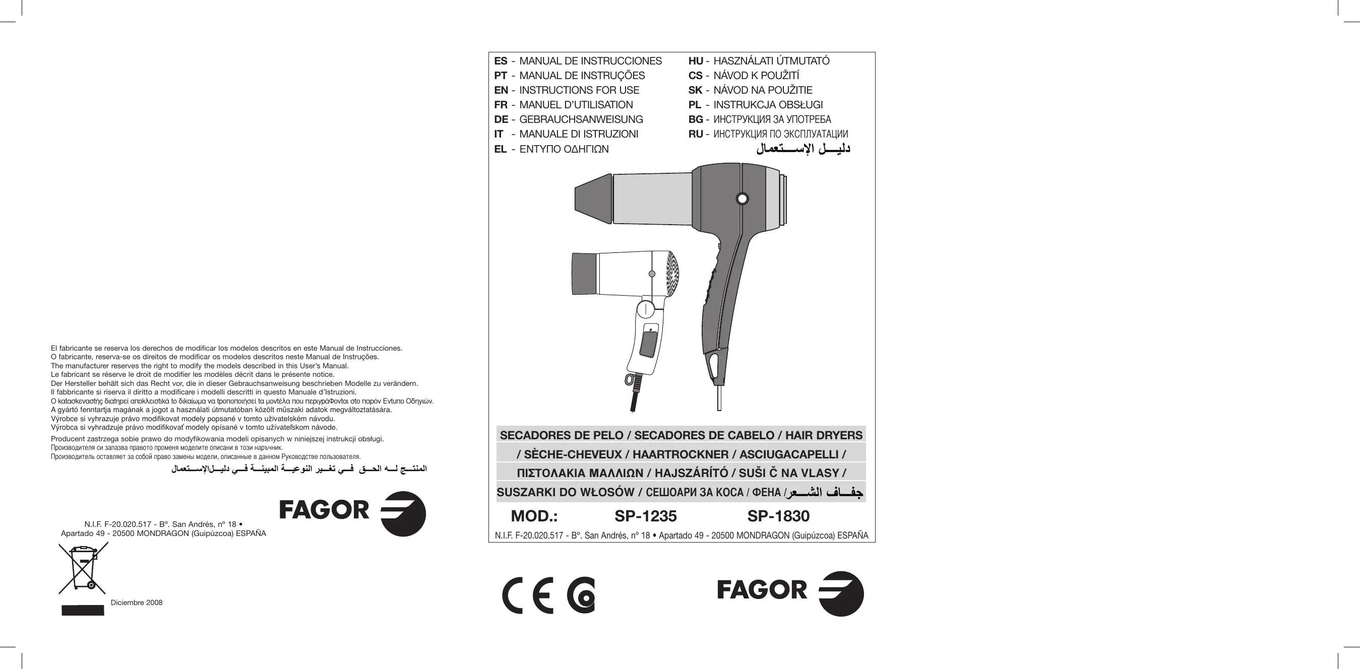 SP-1235 - Sèche cheveux FAGOR - Notice d'utilisation et mode d'emploi gratuit