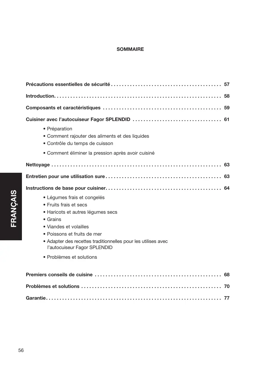 Précautions essentielles de sécurité . . . . . . . . . . . . . . . . . . . . . . . . . . . . . . . . . . . . . . . . . 57 Introduction. . . . . . . . . . . . . . . . . . . . . . . . . . . . . . . . . . . . . . . . . . . . . . . . . . . . . . . . . . . . . . 58 Composants et caractéristiques . . . . . . . . . . . . . . . . . . . . . . . . . . . . . . . . . . . . . . . . . . . . 59 Cuisiner avec l’autocuiseur Fagor SPLENDID . . . . . . . . . . . . . . . . . . . . . . . . . . . . . . . . . 61 • Préparation • Comment rajouter des aliments et des liquides • Contrôle du temps de cuisson • Comment éliminer la pression après avoir cuisiné Nettoyage . . . . . . . . . . . . . . . . . . . . . . . . . . . . . . . . . . . . . . . . . . . . . . . . . . . . . . . . . . . . . . . 63 Entretien pour une utilisation sure . . . . . . . . . . . . . . . . . . . . . . . . . . . . . . . . . . . . . . . . . . . 63