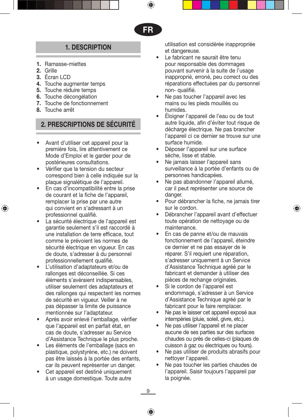 Éviter que le cordon ne touche les parties chaudes de l’appareil. Lorsque l’appareil est en fonctionnement, la grille peut atteindre des températures très élevées et il existe donc un risque de brûlures. Utiliser des fourchettes ou ustensiles similaires pour retirer les toasts de la grille. Veillez à ce qu’il n’y ait aucun objet inflammable près du grille-pain ou dessus, tel que rideaux, chiffons, etc. Ne jamais recouvrir le grillepain lorsqu’il est chaud ou en fonctionnement. Après avoir utilisé l’appareil, le laisser refroidir complètement avant de le ranger. Cet appareil est exclusivement destiné à faire griller du pain. Ne pas l’utiliser avec d’autres aliments. Ne jamais utiliser le grille-pain sans le ramasse-miettes. Ce grille-pain a été conçu pour une utilisation à 80% de sa surface. Par conséquent, veiller à ne pas recouvrir totalement de pain la surface de la grille; laisser des espaces libres entre les tranches de pain. maximum est de 300 secondes et le minimum de 15 secondes.