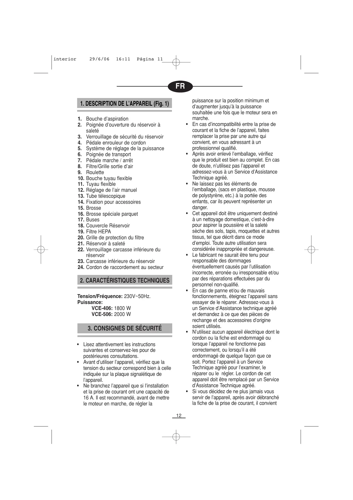 puissance sur la position minimum et d’augmenter jusqu’à la puissance souhaitée une fois que le moteur sera en marche. En cas d’incompatibilité entre la prise de courant et la fiche de l’appareil, faites remplacer la prise par une autre qui convient, en vous adressant à un professionnel qualifié. Après avoir enlevé l’emballage, vérifiez que le produit est bien au complet. En cas de doute, n’utilisez pas l’appareil et adressez-vous à un Service d’Assistance Technique agréé. Ne laissez pas les éléments de l’emballage, (sacs en plastique, mousse de polystyrène, etc.) à la portée des enfants, car ils peuvent représenter un danger. Cet appareil doit être uniquement destiné à un nettoyage domestique, c’est-à-dire pour aspirer la poussière et la saleté sèche des sols, tapis, moquettes et autres tissus, tel que décrit dans ce mode d’emploi. Toute autre utilisation sera considérée inappropriée et dangereuse. Le fabricant ne saurait être tenu pour responsable des dommages éventuellement causés par l’utilisation incorrecte, erronée ou irresponsable et/ou par des réparations effectuées par du personnel non-qualifié. En cas de panne et/ou de mauvais fonctionnements, éteignez l’appareil sans essayer de le réparer. Adressez-vous à un Service d’Assistance technique agréé et demandez à ce que des pièces de rechange et des accessoires d’origine soient utilisés. N’utilisez aucun appareil électrique dont le cordon ou la fiche est endommagé ou lorsque l’appareil ne fonctionne pas correctement, ou lorsqu’il a été endommagé de quelque façon que ce soit. Portez l’appareil à un Service Technique agréé pour l’examiner, le réparer ou le régler. Le cordon de cet appareil doit être remplacé par un Service d’Assistance Technique agréé. Si vous décidez de ne plus jamais vous servir de l’appareil, après avoir débranché la fiche de la prise de courant, il convient interior 29/6/06 16:11 Página 12 de le rendre inutilisable en coupant le câble d’alimentation. L’utilisation de tout appareil électrique requiert le respect de certaines règles essentielles. vers l’avant et emboîtez-y la brosse (15), la brosse pour parquet (16) ou l’une des buses (17) et introduisez le tuyau flexible (11) à l’autre bout du tube télescopique (Fig. 2). Introduisez le tuyau flexible dans la bouche d’aspiration (1), en faisant coïncider la bouche du tuyau (10) avec la bouche d’aspiration, jusqu’à ce que le tuyau soit bien mis en place. Pour l’enlever, appuyez sur le bouton du tuyau flexible et tirez (Fig. 3). Tirez sur le cordon de branchement (24) et branchez-le au secteur. Attention: Au bout du cordon vous observerez une marque jaune. Vous ne devez jamais tirer sur le cordon au-delà de cette marque, afin d’éviter de provoquer des dommages irréparables à l’enrouleur automatique de cordon. En particulier: