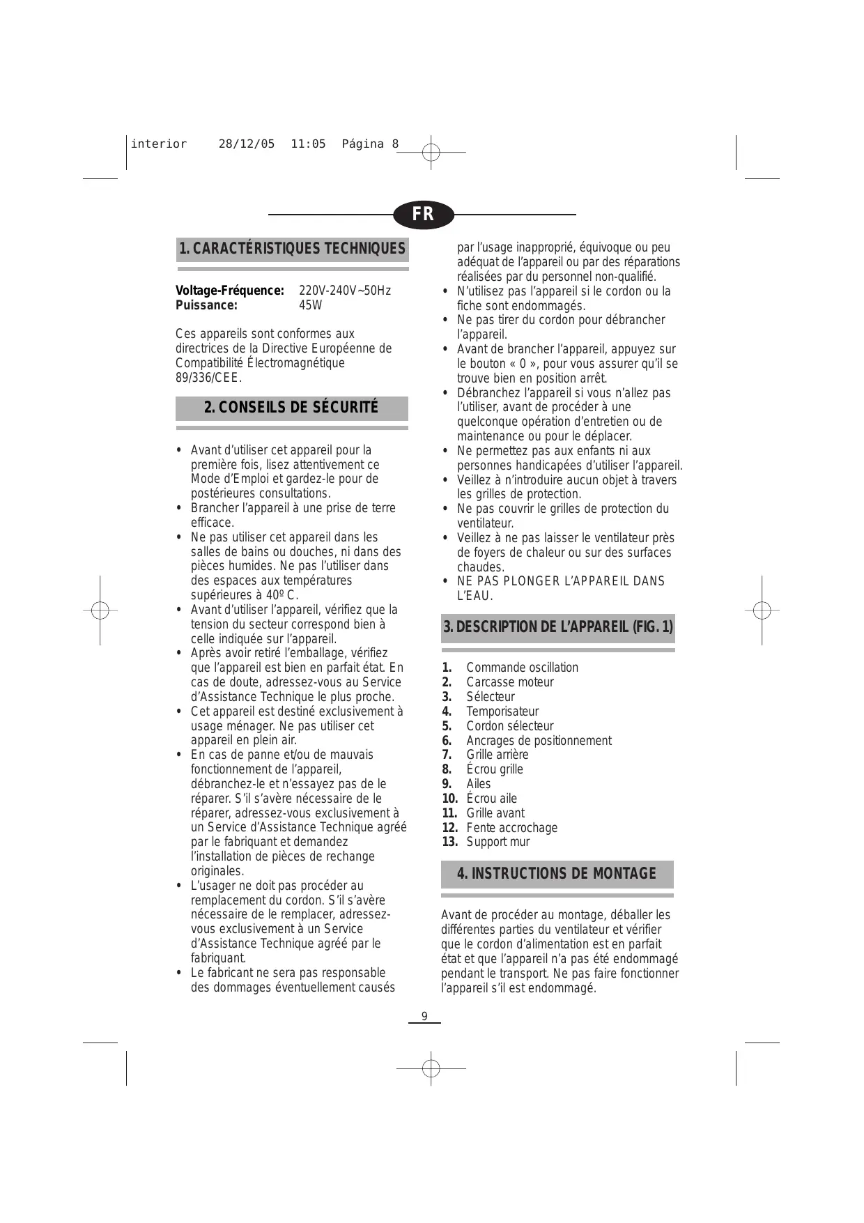 +_ Avant d'utiliser cet appareil pour la première fois, lisez attentivement ce Mode d'Emploi et gardez-le pour de postérieures consultations. Brancher l'appareil à une prise de terre efficace. + Ne pas utiliser cet appareil dans les salles de bains ou douches, ni dans des pièces humides. Ne pas l'utiliser dans des espaces aux températures supérieures à 402 C + Avant d'utiliser l'appareil, vérifiez que la tension du secteur correspond bien à celle indiquée sur l'appareil. + _ Après avoir retiré l'emballage, vérifiez que l'appareil est bien en parfait état. En cas de doute, adressez-vous au Service d’Assistance Technique le plus proche. Cet appareil est destiné exclusivement à usage ménager. Ne pas utiliser cet appareil en plein air. + En cas de panne et/ou de mauvais fonctionnement de l'appareil, débranchez-le et n'essayez pas de le réparer. S'il s'avère nécessaire de le réparer, adressez-vous exclusivement à un Service d'Assistance Technique agréé par le fabriquant et demandez l'installation de pièces de rechange originales. L'usager ne doit pas procéder au remplacement du cordon. S'il s'avère nécessaire de le remplacer, adressez- vous exclusivement à un Service d'Assistance Technique agréé par le fabriquant. Le fabricant ne sera pas responsable des dommages éventuellement causés par l'usage inapproprié, équivoque ou peu adéquat de l'appareil ou par des réparations réalisées par du personnel non-qualifié. + N'utilisez pas l'appareil si le cordon ou la fiche sont endommagés. Ne pas tirer du cordon pour débrancher l'appareil. + Avant de brancher l'appareil, appuyez sur le bouton « 0 », pour vous assurer qu'il se trouve bien en position arrêt. Débranchez l'appareil si vous n'allez pas l'utiliser, avant de procéder à une quelconque opération d'entretien ou de maintenance ou pour le déplacer. + Ne permettez pas aux enfants ni aux personnes handicapées d'utiliser l'appareil. + Veillez à n'introduire aucun objet à travers les grilles de protection + Ne pas couvrir le grilles de protection du ventilateur. + Veillez à ne pas laisser le ventilateur près de foyers de chaleur ou sur des surfaces chaudes.