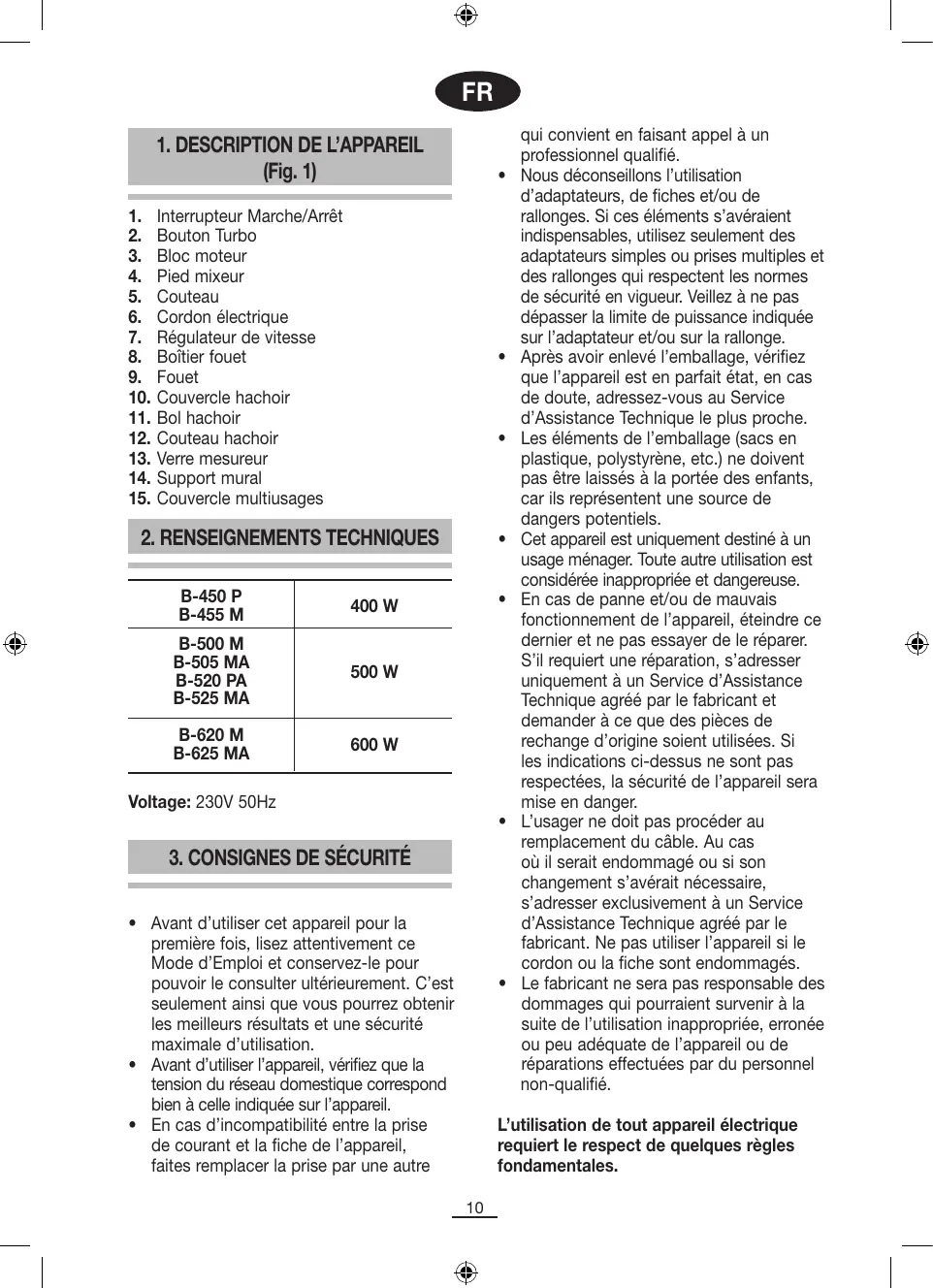 - Ne pas utiliser l’appareil et ne placer aucune de ses parties sur des surfaces chaudes ou près de celles-ci (plaques de cuisson à gaz ou électriques ou fours). Le mixeur à main est parfait pour préparer des aliments légers : pour faire des sauces, des soupes, de la mayonnaise ou des purées. Tournez le pied mixeur sur le bloc moteur, dans le sens contraire des aiguilles d’une montre, jusqu’à ce qu’il se verrouille en position. Une fois le pied mixeur (4) bien mis en place, branchez l’appareil au secteur. Verser les ingrédients à battre dans un récipient adéquat et introduisez le pied mixeur tel qu’indiqué sur la Figure 2. Appuyez sur l’interrupteur Marche/Arrêt (1). Sur les modèles B-520PA, B-525MA, B-620M et B-625MA, sélectionnez la vitesse en faisant tourner le régulateur de vitesse (7). Si nécessaire, appuyez sur le bouton Turbo (2) pour battre à la vitesse maximale. Fonction fouet Insérez le fouet dans son boîtier, jusqu’à ce qu’il se verrouille en position (Fig. 5). Insérez ensuite le boîtier dans le bloc moteur (Fig. 6). Placez le fouet dans le récipient, branchez l’appareil au secteur et appuyez sur la touche Marche/Arrêt, pour commencer à battre. Sélectionnez la vitesse souhaitée à l’aide du régulateur de vitesse (uniquement modèles B-520PA, B-505MA, B-525MA et B-625MA) ou appuyez sur le bouton Turbo. Vous pouvez utiliser le verre (13) ou un autre récipient pour battre les ingrédients. Vous pouvez garder le contenu dans le bol, dûment fermé avec son couvercle.