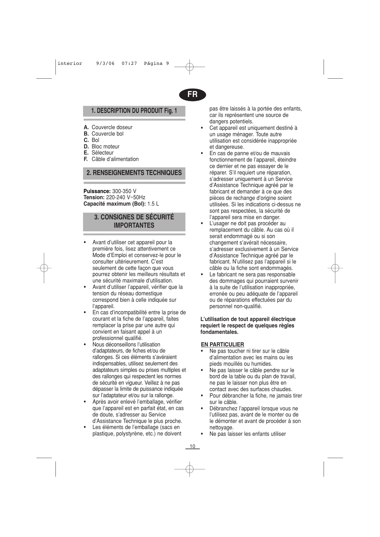 interior 9/3/06 07:27 Página 10 pièces avant de les remettre en place. l’appareil. Ne pas utiliser l’appareil en plein air. Pour éviter tout risque de décharges électriques, ne pas plonger l’appareil, ni le câble, ni la fiche dans l’eau, ni dans aucun autre liquide.