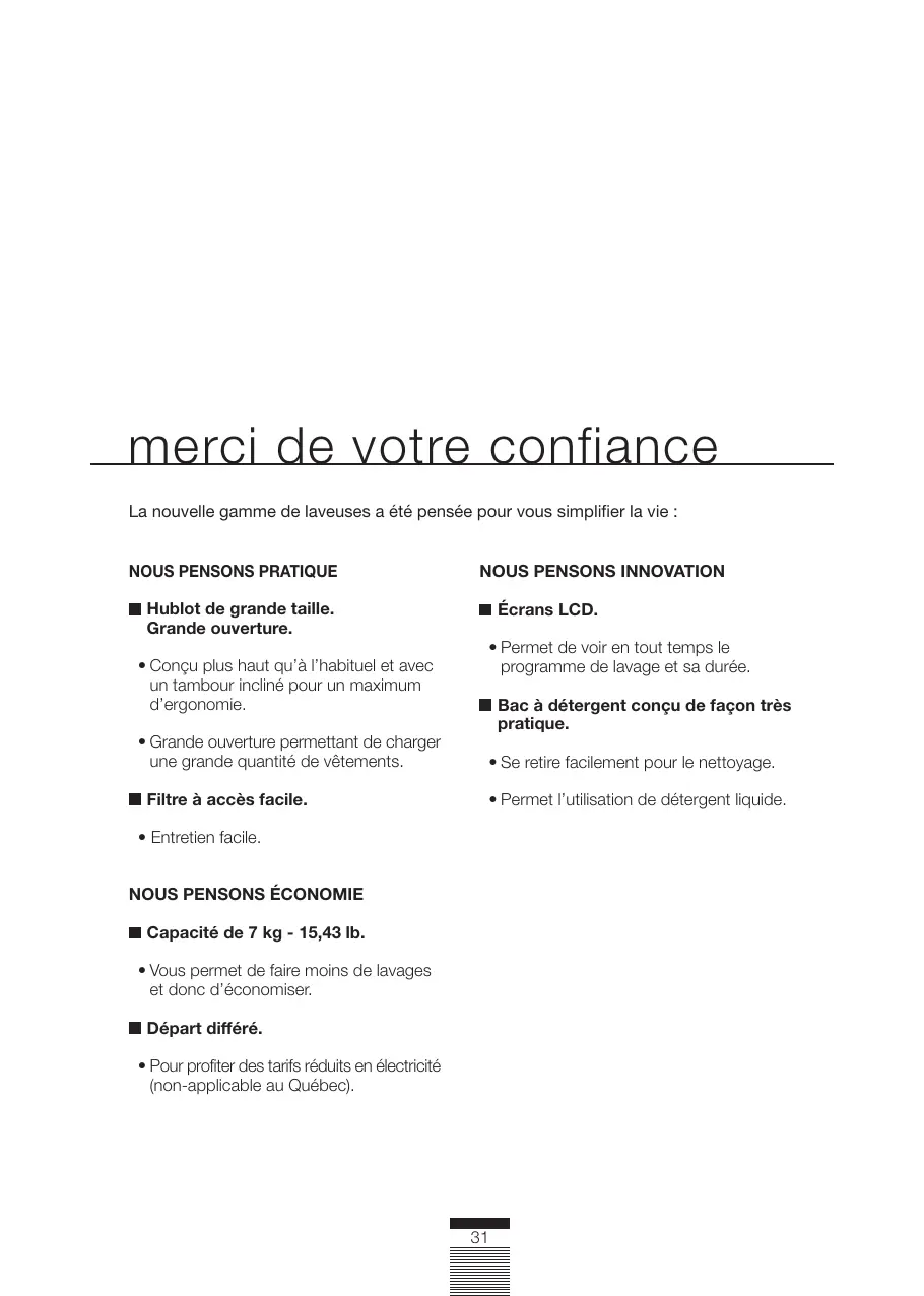 table des matières merci de votre confiance La nouvelle gamme de laveuses a été pensée pour vous simplifier la vie : Hublot de grande taille. Grande ouverture.